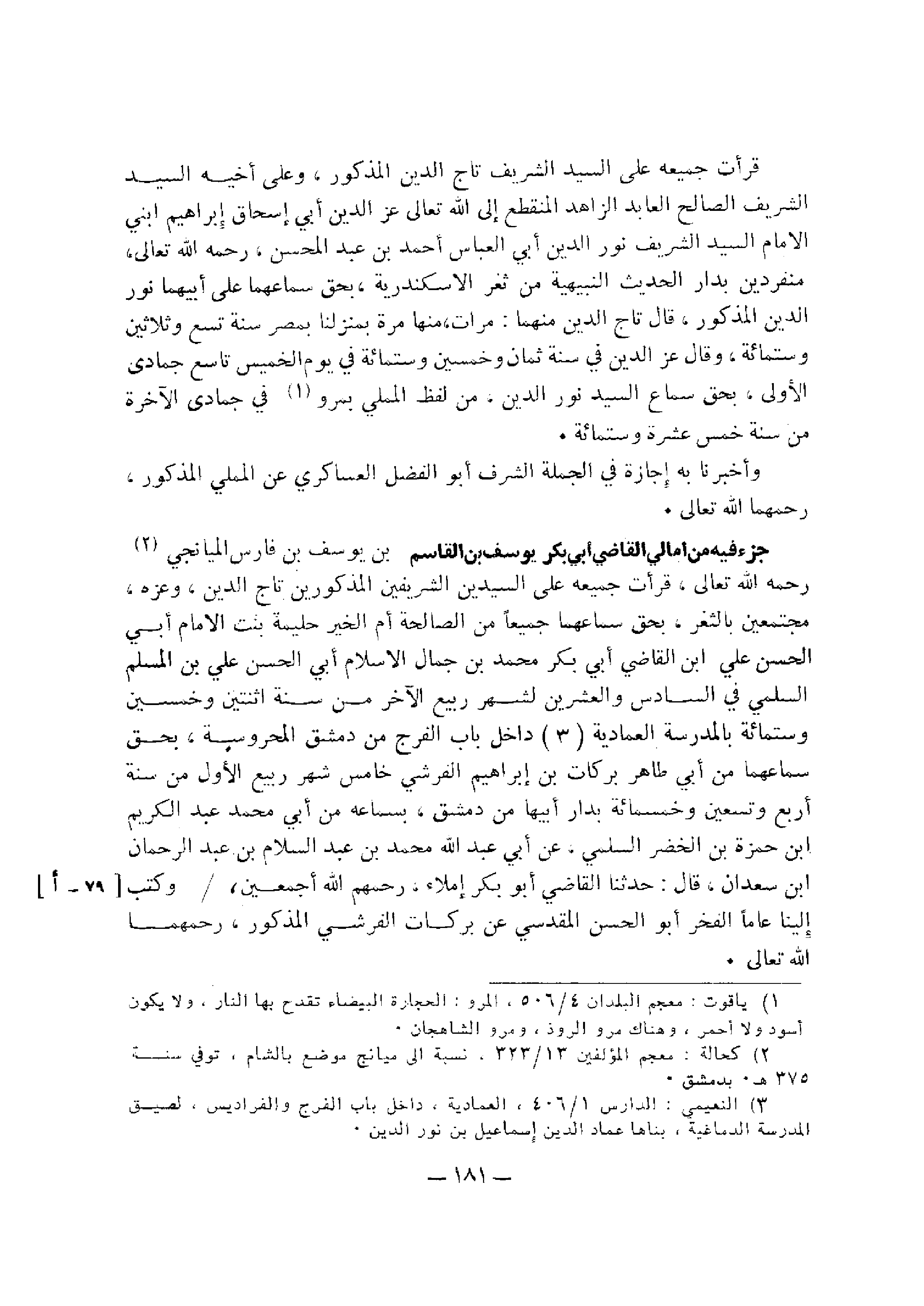 جزء فيه من أمالي القاضي أبو بكر يوسف بن القاسم بن يوسف بن فارس الميانجي، رحمه الله تعالى، قرأت جميعه علي السيدين الشريفين المذكورين تاج الدين، وعزه، مجتمعين بالثغر، بحق سماعهما جميعًا من الصالحة أم الخير حليمة بنت الإمام أبي الحسن علي بن الباقي أبي بكر محمد بن جمال الإسلام أبي الحسن علي بن المسلم السلمي في السادس والعشرين لشهر ربيع الآخر من سنة اثنتين وخمسين وست مائة بالمدرسة العمادية، داخل باب الفرج من دمشق المحروسة، بحق سماعهما من أبي طاهر بركان بن إبراهيم الفرشي خامس شهر ربيع الأول من سنة أربع وتسعين وخمس مائة بدار أبيها من دمشق، بسماعه من أبي محمد عبد الكريم بن حمزة بن الخضر السلمي، عن أبي عبد الله محمد بن عبد السلام بن عبد الرحمن بن سعدان قال: حدثتا القاضي أبو بكر إملاء، رحمهم الله أجمعين، وكتب إلينا عامًا الفخر أبو الحسن المقدسي عن بركات الفرشي المذكور، رحمهما الله تعالى.