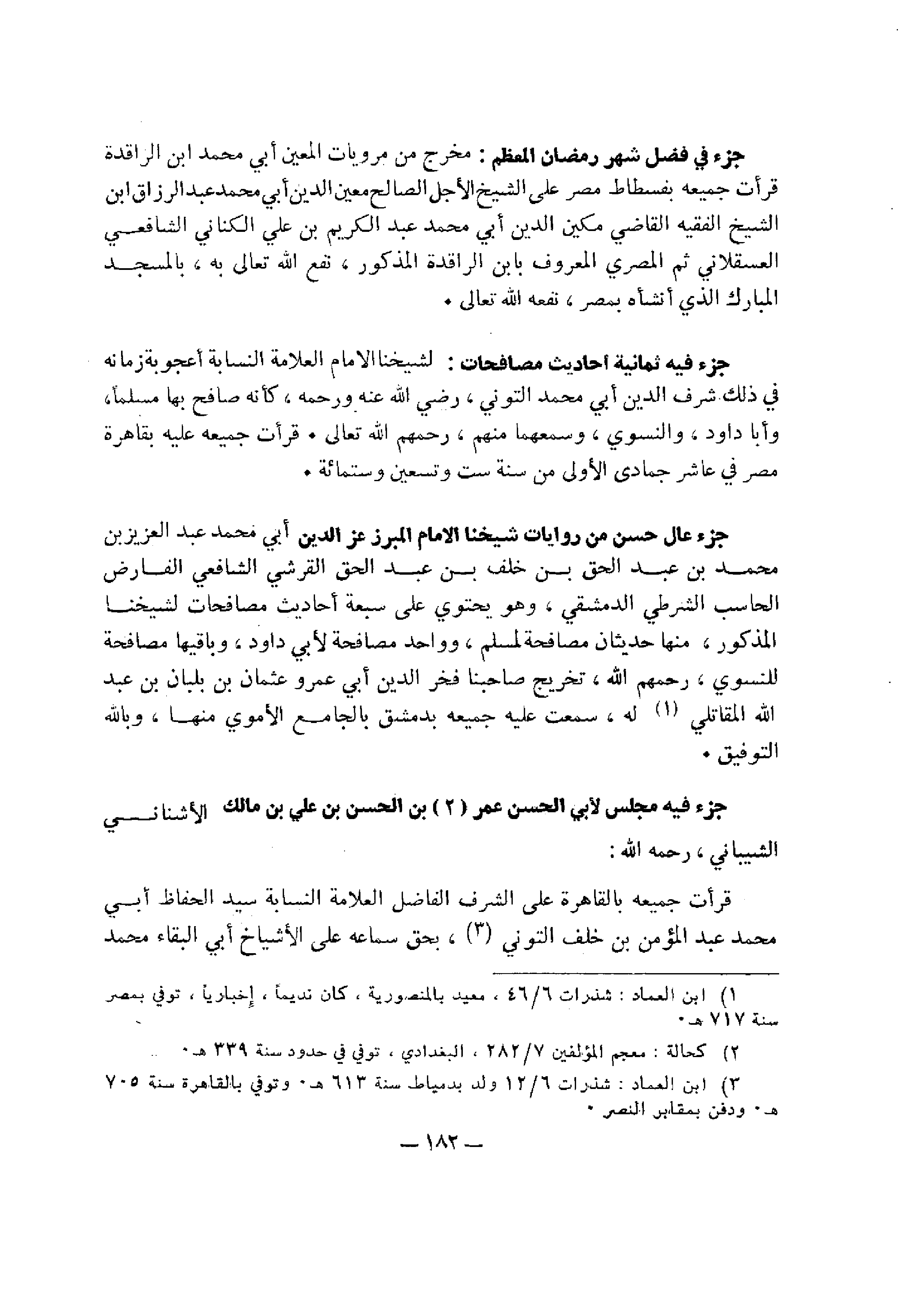 جزء عال حسن من روايات شيخنا الإمام المبرز عز الدين: أبي محمد عبد العزيز بن محمد بن عبد الحق بن خلف بن عبد الحق القرشي الشافعي الفارض الحاسب الشرطي الدمشقي، وهو يحتوي علي سبعة أحاديث مصافحات لشيخنا المذكور، منها حديثان مصافحة لمسلم، وواحد مصافحة لأبي داود، وباقيها مصافحة لشيخنا المذكور، منها حديثان مصافحة لمسلم، وواحد مصافحه لأبي داود، وباقيها مصافحة للنسوي، رحمهم الله، تخريج صاحبنا فخر الدين أبو عمرو عثمان بن بلبان بن عبد الله المقاتلي له، سمعت عليه جميعه بدمشق بالجامع الأموي منها، وبالله التوفيق.