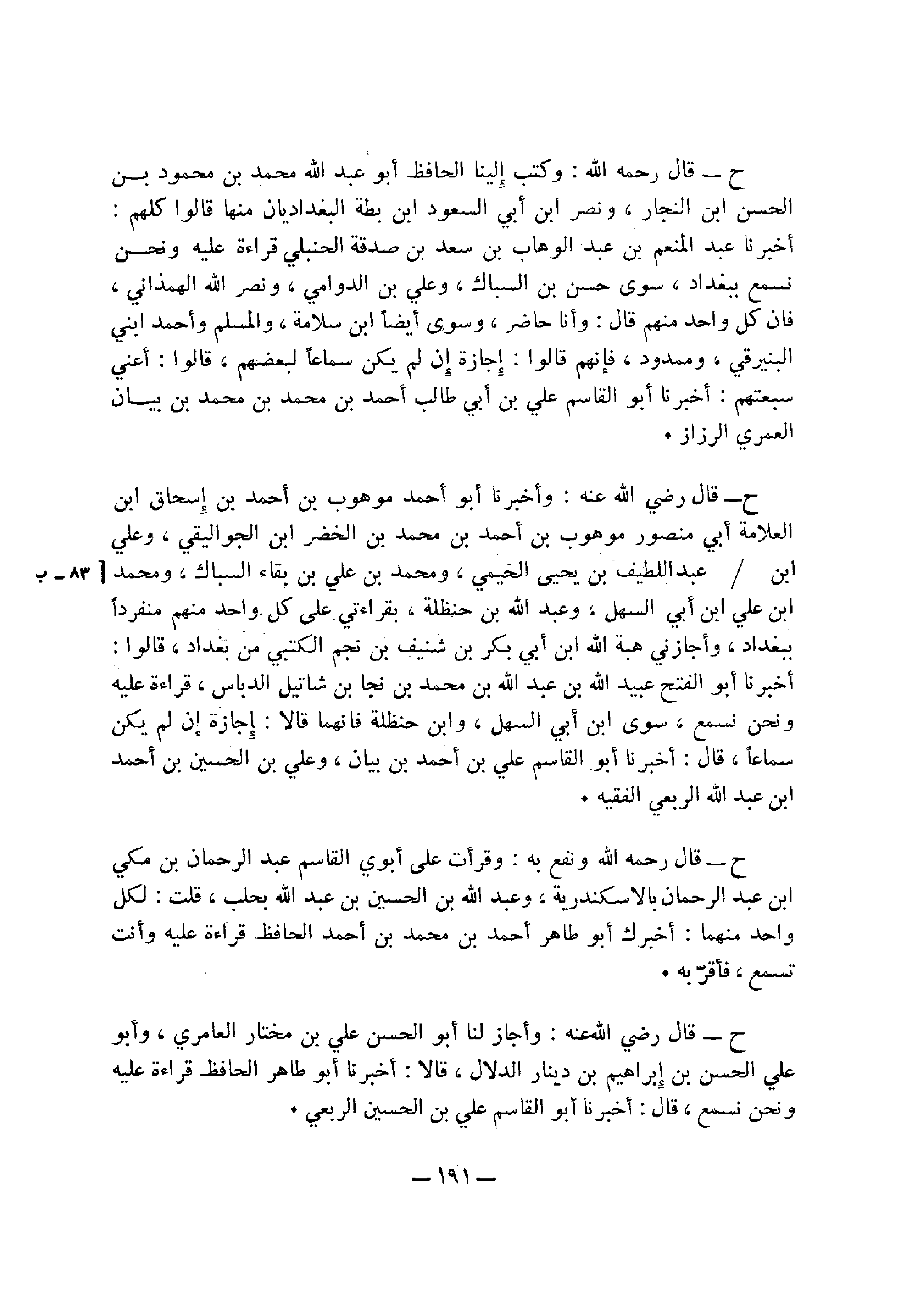 ح قال رحمه الله: وكتب إلينا الحافظ أبو عبد الله محمد بن محمود بن الحسن بن النجار، ونصر بن أبي السعود بن بطة البغداديان منها , قالوا كلهم أخبرنا عبد المنعم بن عبد الوهاب بن سعد بن صدقة الحنبلي قراءة عليه , ونحن نسمع ببغداد، سوي حسن بن السباك، وعلي بن الدوامي، ونصر الله الهمذاني، فان كل واحد منهم قال: وأنا حاضر، وسوي أيضًا ابن سلامة، والمسلم وأحمد ابني البنيرقي، وممدود، فإنهم قالوا: إجازة أن لم يكن سماعًا لبعضهم، قالوا: أعني سبعتهم أخبرنا أبو القاسم علي بن أبي طالب أحمد بن محمد بن محمد بن بيان العمري الرزاز.