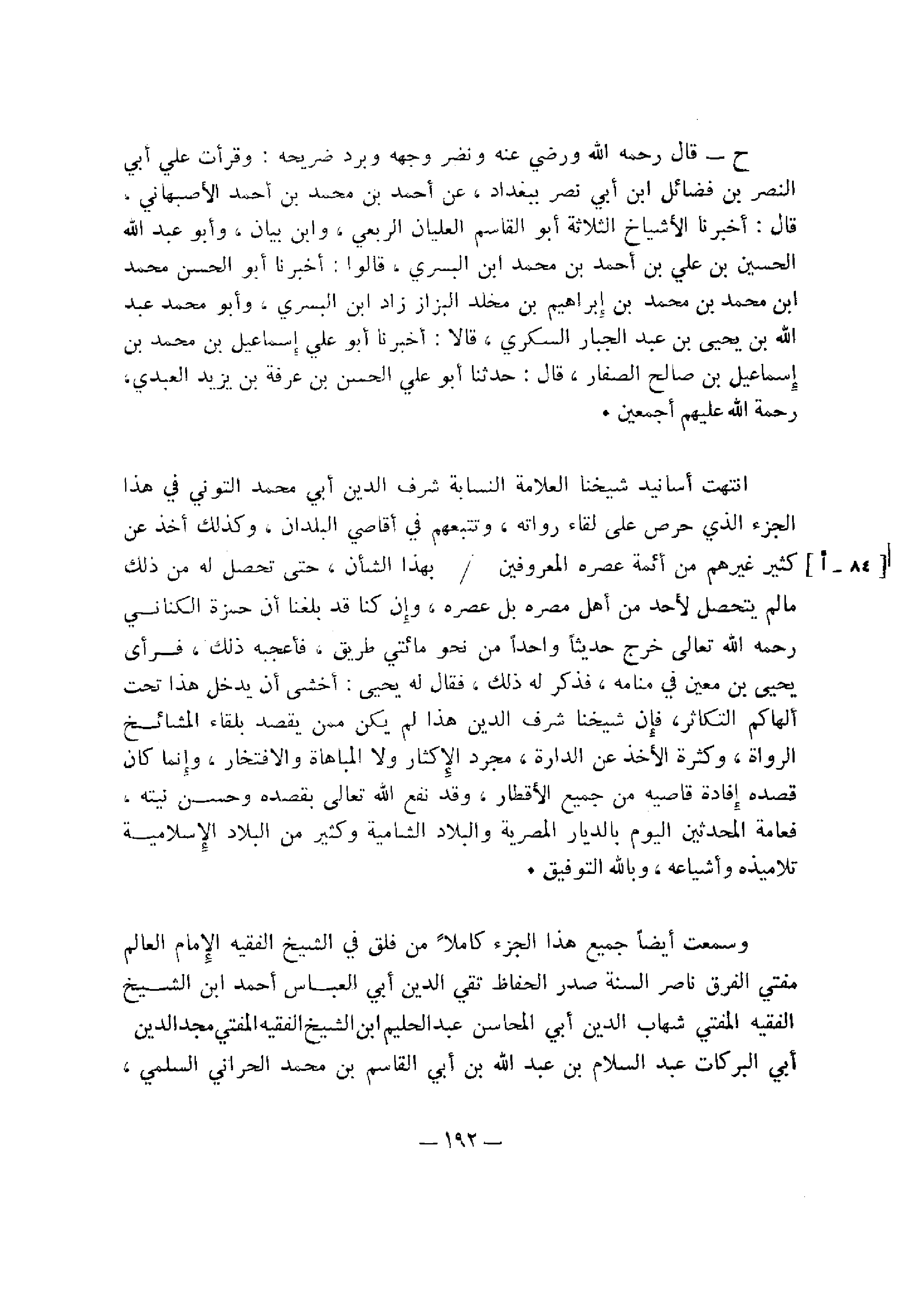 وسمعت أيضًا جميع هذا الجزء كَامِلا من فلق في الشيخ الفقيه الإمام العالم مفتي الفرق ناصر السنة صدر الحفاظ تقي الدين أبي العباس أحمد ابن الشيخ الفقيه المفتي شهاب الدين أبي المحاسن عبد الحليم بن الشيخ الفقيه المفتي مجد الدين أبي البركات عبد السلام بن عبد الله بن أبي القاسم بن محمد الحراني، السلمي،
