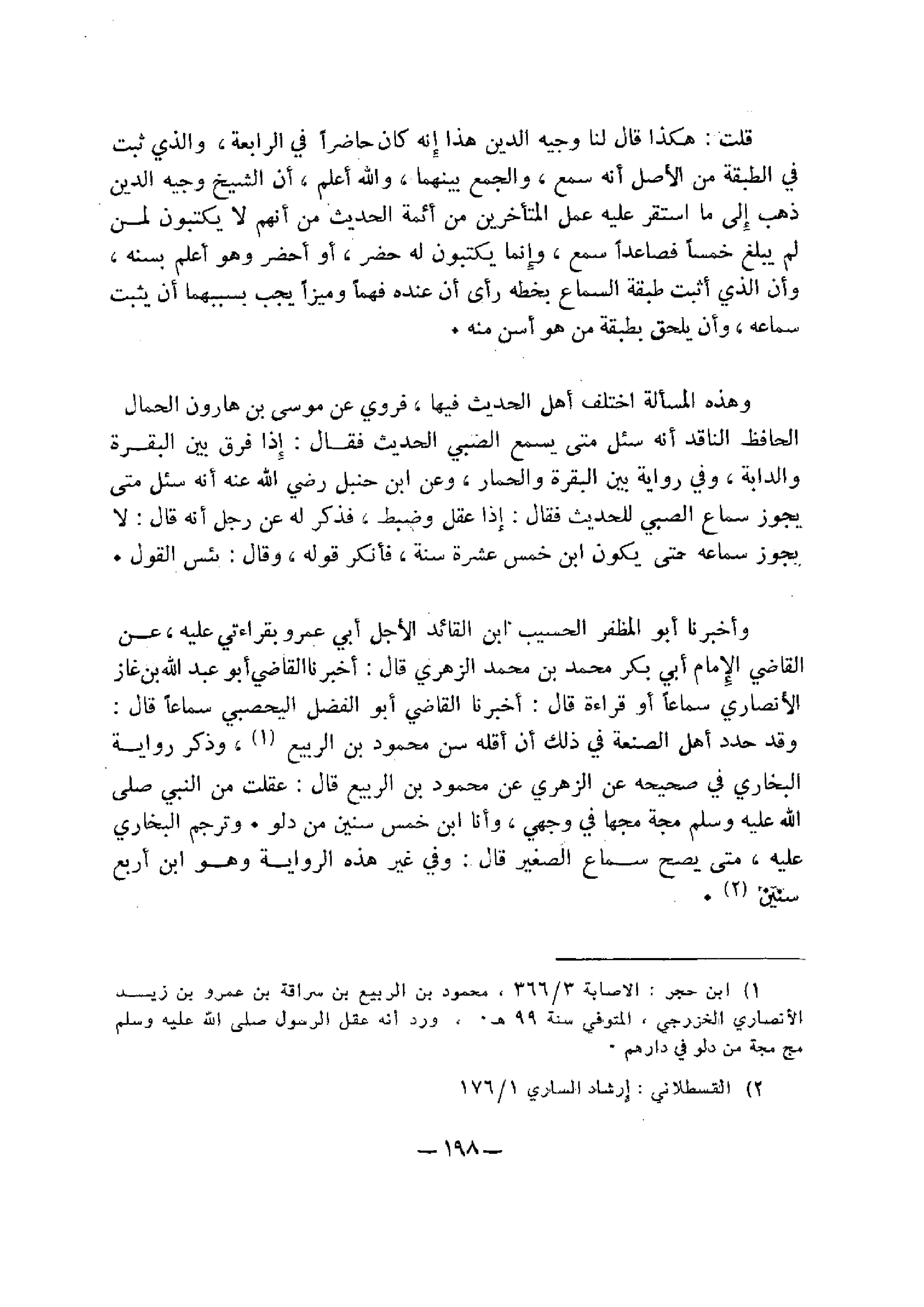 وَأَخْبَرَنَا أَبُو الْمُظَفَّرِ الْحَسِيبُ ابْنُ الْقَائِدِ الْأَجَلِّ أَبُي عَمْرٍو بِقِرَاءَتِي عَلَيْهِ، عَنِ الْقَاضِي الْإِمَامِ أَبِي بَكْرٍ مُحَمَّدِ بْنِ مُحَمَّدٍ الزُّهْرِيِّ , قَالَ: أَخْبَرَنَا الْقَاضِي أَبُو عَبْدِ اللَّهِ بْنِ غَازٍ الْأَنْصَارِيُّ سَمَاعًا أَوْ قِرَاءَتَهُ , قَالَ: أَخْبَرَنَا الْقَاضِي أَبُو الْفَضْلِ الْيَحْصُبِيُّ سَمَاعًا، قَالَ: وَقَدْ حَدَّدَ أَهْلُ الصَّنْعَةِ فِي ذَلِكَ أَنْ أَقَلَّهُ سِنُّ مَحْمُودِ بْنِ الرَّبِيعِ، وَذَكَرَ رِوَايَةَ الْبُخَارِيِّ فِي صَحِيحِهِ عَنِ الزُّهْرِيِّ، عَنْ مَحْمُودِ بْنِ الرَّبِيعِ , قَالَ: «عَقَلْتُ مِنَ النَّبِيِّ صَلَّى اللَّهُ عَلَيْهِ وَسَلَّمَ مَجَّهُ مَجَّهَا فِي وَجْهِي، وَأَنَا ابْنُ خَمْسِ سِنِينَ مِنْ دَلْوٍ» .