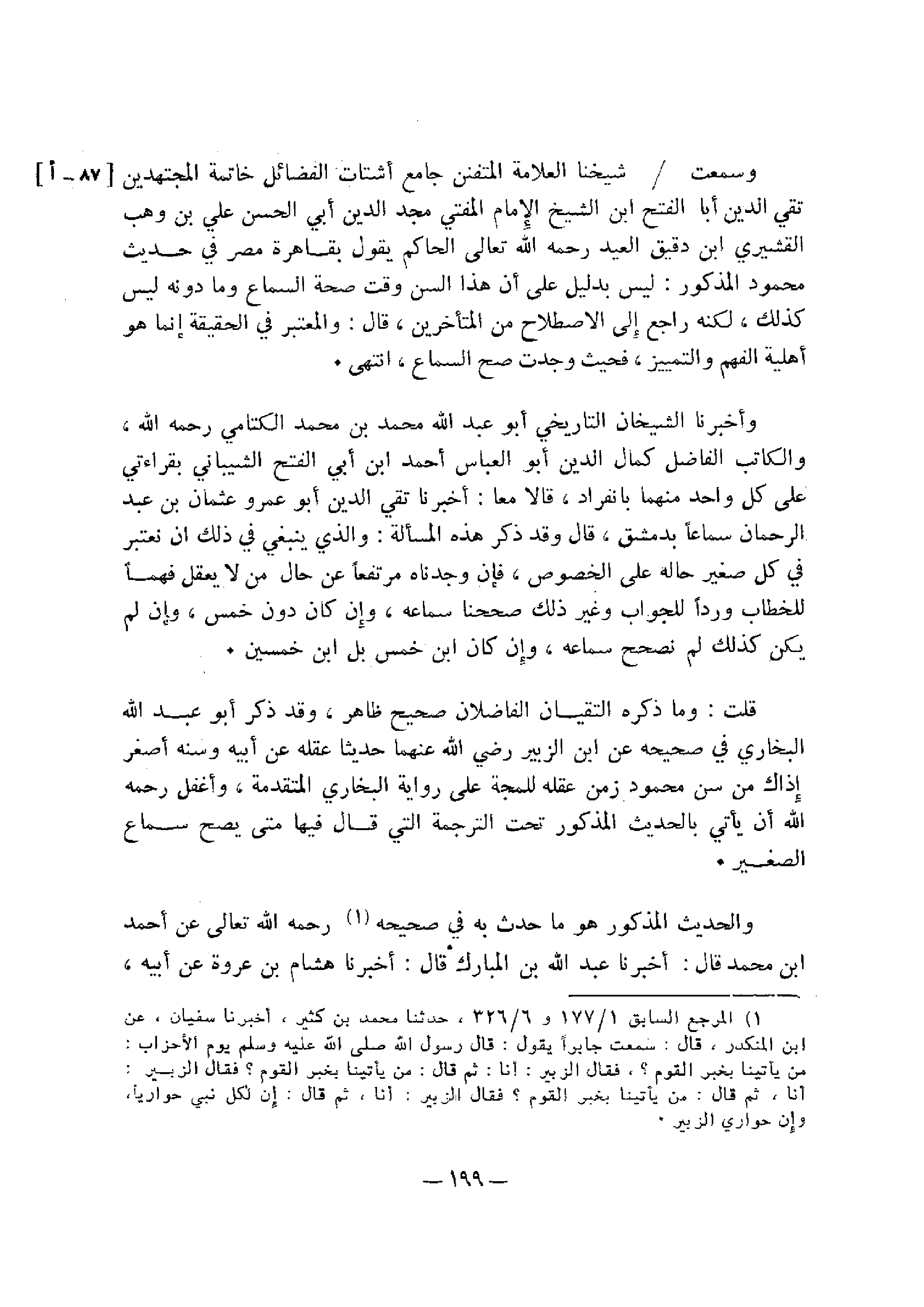 وأخبرنا الشيخ التاريخي أبو عبد الله محمد بن محمد الكتامي رحمه الله، والكاتب الفاضل كمال الدين أبو العباس أحمد بن أبي الفتح الشيباني بقراءتي علي كل واحد منها بانفراد، قالا معا: أخبرنا تقي الدين أبو عمرة عثمان بن عبد الرحمن سماعًا بدمشق، قال: قال وقد ذكر هذه المسألة: «والذي ينبغي في ذلك ان نعتبر في كل صغير حاله علي الخصوص، فإن وجدناه مرتفعًا عن حال من لا يعقل فهما للخطاب وردًا للجواب وغير ذلك صححنا سماعه، وإن كان دون خمس، وإن لم يكن كذلك لم نصحح سماعه، وإن كان ابن خمس بل ابن خمسين» .