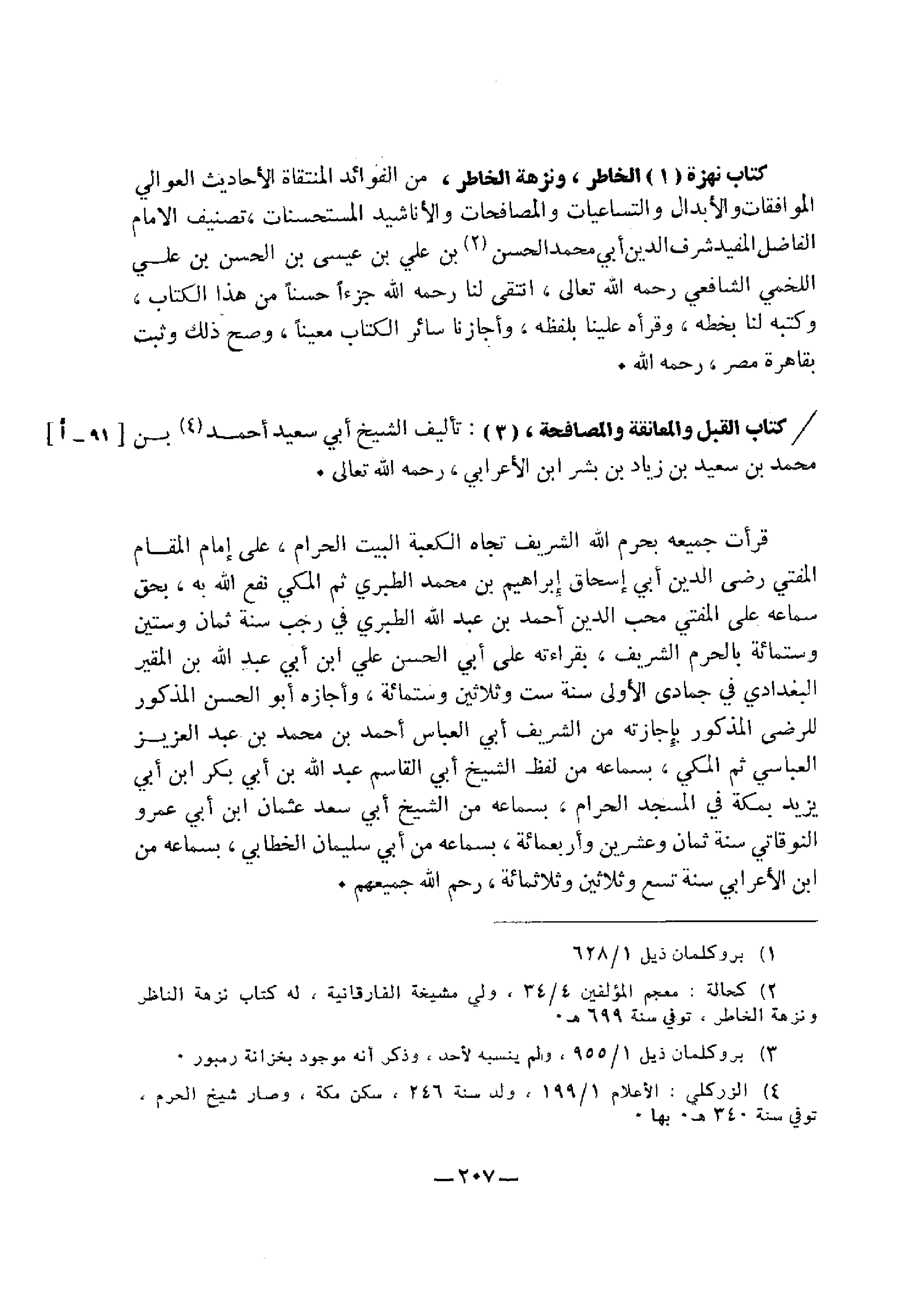 كتاب نهزة الخاطر، ونزهه الخاطر، من الفوائد المنتقاة الأحاديث العوالي الموافقات والأبدال والتساعات والمصافحات والأناشيد المستحسنات، تصنيف الإمام الفاضل المفيد شرف الدين أبي محمد الحسن بن علي بن عيسي بن الحسن بن علي اللخمي الشافعي رحمه الله تعالى، انتقي لنا رحمه الله جزءًا حسنا من هذا الكتاب، وكتبه لنا بخطه، وقرأه علينا بلفظه، وأجازنا سائر الكتاب معينًا، وصح ذلك وثبت بقاهرة مصر، رحمه الله.