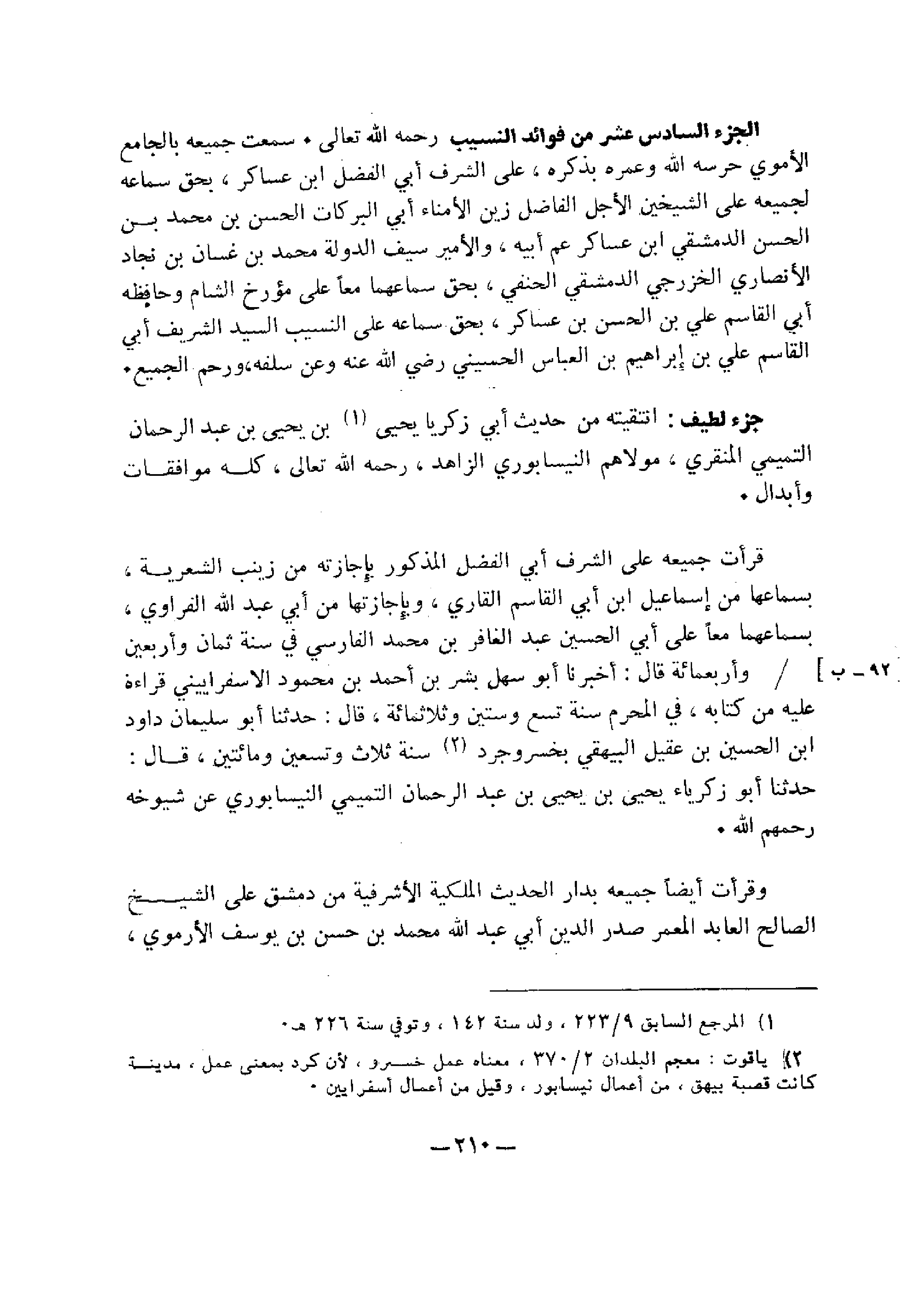 قرأت جميعه علي الشرف أبي الفضل المذكور بإجازته من زينب الشعرية، بسماعها من إسماعيل ابن أبي القاسم القاري، وبإجازتها من أبي عبد الله الفراوي، بسماعهما معًا علي أبي الحسين عبد الغافر بن محمد الفارسي في سنة ثمان وأربعين وأربع مائة قال: أخبرنا أبو سهل بشر بن أحمد بن محمود الإسفراينيي قراءة عليه من كتابة، وفي المحرم سنة تسع وستين وثلاث مائة، قال: حدثنا أبو سليمان داود ابن الحسين بن عقيل البيهقي بخسروجرد، سنة ثلاث وتسعين ومائتين، قال: حدثنا أبو زكرياء يحيى بن يحيى بن عبد الرحمن التميمي النيسابوري، عن شيوخه رحمهم الله.