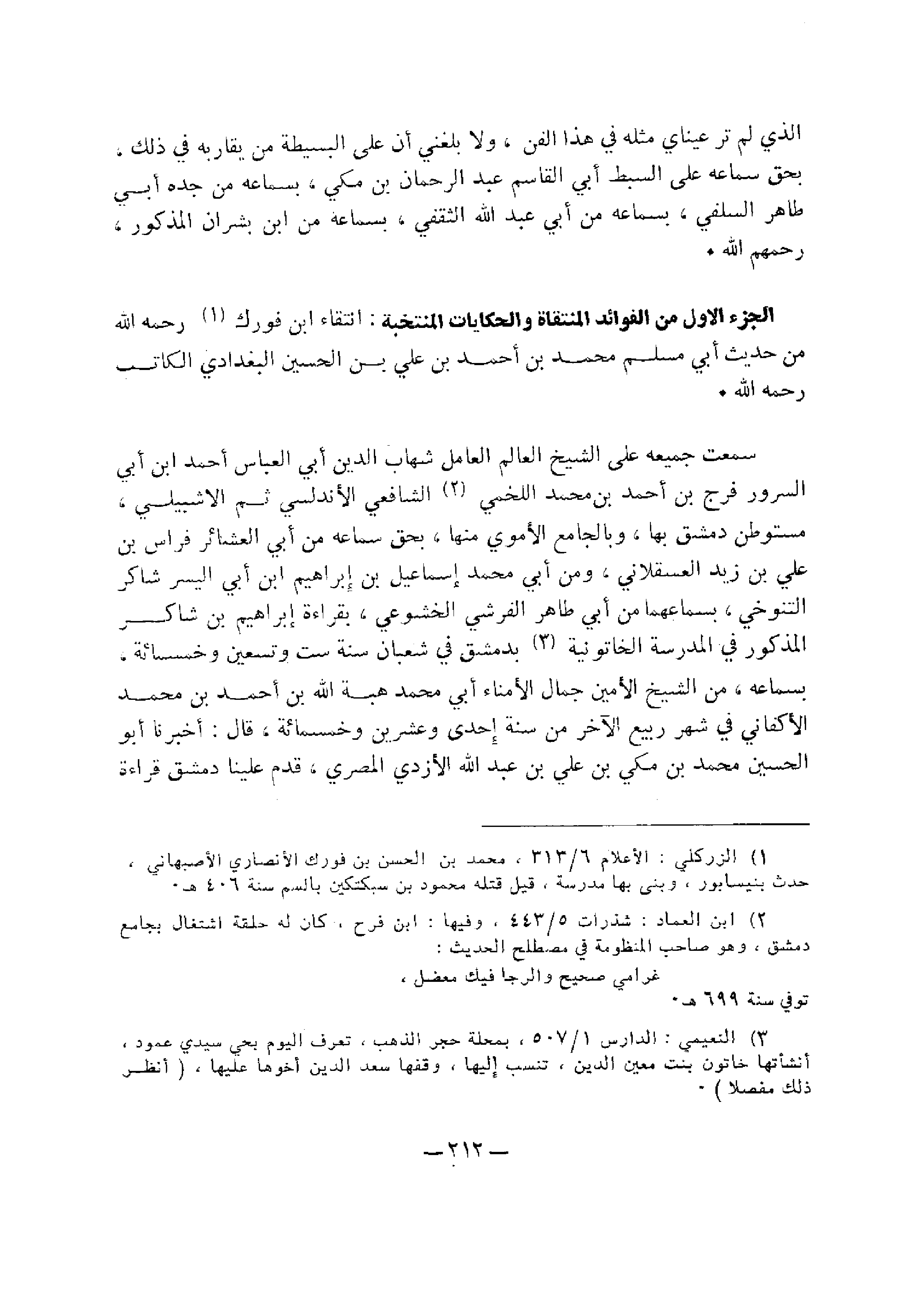 سمعت جميعه على الشيخ العالم العامل شهاب الدين أبي العباس أحمد ابن أبي السرور فرج بن أحمد بن محمد اللخمي، الشافعي الأندلسي ثم الإشبيلي، مستوطن دمشق بها، وبالجامع الأموي منها، بحق سماعه من أبي العشائر فراس بن علي بن زيد العسقلاني، ومن أبي محمد إسماعيل بن إبراهيم ابن أبي اليسر شاكر التنوخي، بسماعهما من أبي طاهر الفرشي الخشوعي، بقراءة إبراهيم بن شاكر المذكور في المدرسة الخاتونية، بدمشق في شعبان سنة ست وتسعين وخمس مائة، بسماعه، من الشيخ الأمين جمال الأمناء أبي محمد هبة الله بن أحمد بن محمد الأكفاني في شهر ربيع الآخر من سنة إحدى وعشرين وخمس مائة، قال: أخبرنا أبو الحسين محمد بن مكي بن علي بن عبد الله الأزدي المصري، قدم علينا دمشق قراءة