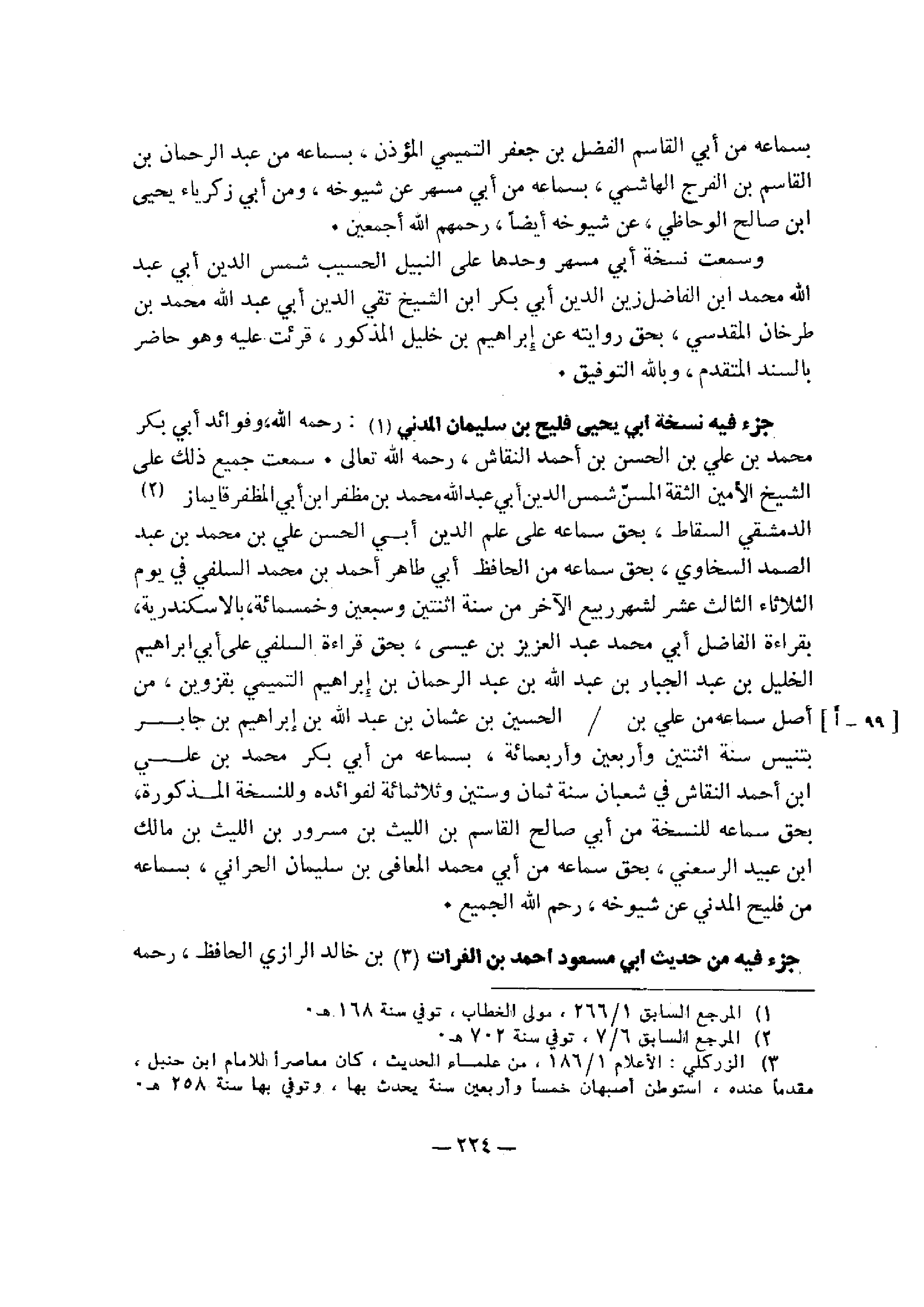 سمعت جميع ذلك على الشيخ الأمين الثقة المسن شمس الدين أبي عبد الله بن مظفر بن أبي المظفر قايماز الدمشقي السقاط، بحق سماعه علي علم الدين أبي الحسن علي بن محمد بن عبد الصمد السخاوي، بحق سماعه من الحافظ أبي طاهر أحمد بن محمد السلفي في يوم الثلاثاء الثالث عشر لشهر ربيع الآخر من سنة اثنتين وسبعين وخمس مائة، بالإسكندرية، بقراءة الفاضل أبي محمد عبد العزيز بن عيسي، بحق قراءة السلفي علي أبي إبراهيم الخليل بن عبد الجبار بن عبد الله بن عبد الرحمن بن إبراهيم التميمي بقزوين، من أصل سماعه من علي بن الحسين بن عثمان بن عبد الله بن إبراهيم بن جابر بتنيس سنة اثنتين وأربعين وأربع مائة، بسماعه من أبي بكر محمد بن علي بن أحمد النقاش في شعبان سنة ثمان وستين وثلاث مائة لفوائده وللنسخة المذكورة، بحق سماعه للنسخة من أبي صالح القاسم بن الليث بن مسرور بن الليث بن مالك بن عبيد الرسعني، بحق سماعه من أبي محمد المعافي بن سليمان الحراني، بسماعه من فليح المدني عن شيوخه، رحم الله الجميع.