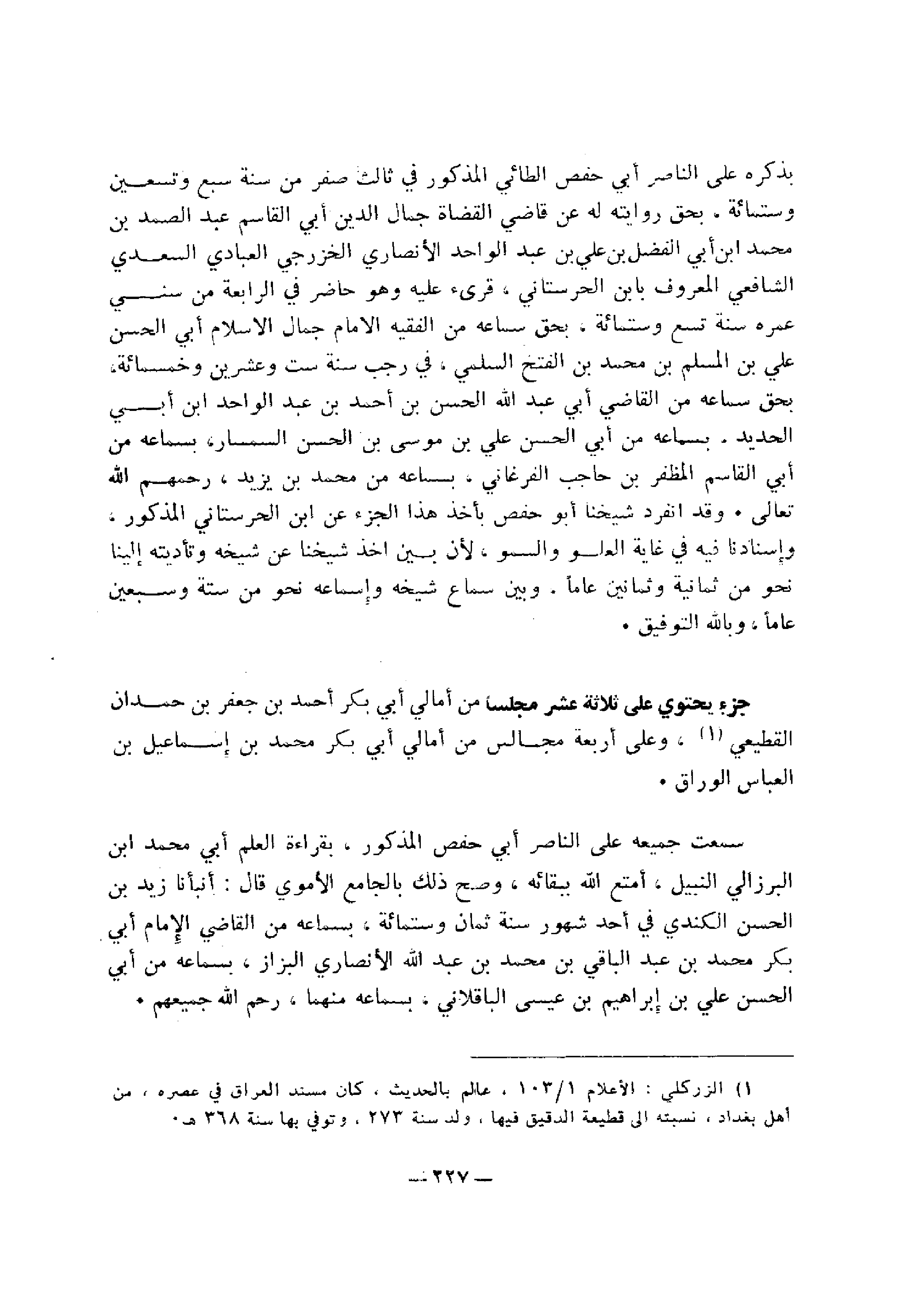 بذكره علي الناصر أبي حفص الطائي المذكور في ثالث صفر من سنة سبع وتسعين وست مائة، بحق روايته له عن قاضي القضاة جمال الدين أبي القاسم عبد الصمد بن محمد بن أبي الفضل بن علي عبد الواحد الأنصاري الخزرجي العبادي السعدي الشافعي المعروف بابن الحرستاني، قرئ عليه وهو حاضر في الرابعة من سني عمره سنة تسع وست مائة، بحق سماعه من الفقيه الإمام جمال الإسلام أبي الحسن علي بن المسلم بن محمد بن الفتح السلمي، في رجب سنة ست وعشرين وخمس مائة، بحق سماعه من القاضي أبي عبد الله الحسن بن أحمد بن عبد الواحد بن أبي الحديد، بسماعه من أبي الحسن علي بن موسي بن الحسن السمسار، بسماعه من أبي القاسم المظفر بن حاجب الفرغاني، بسماعه من محمد بن يزيد، رحمهم الله تعالى.