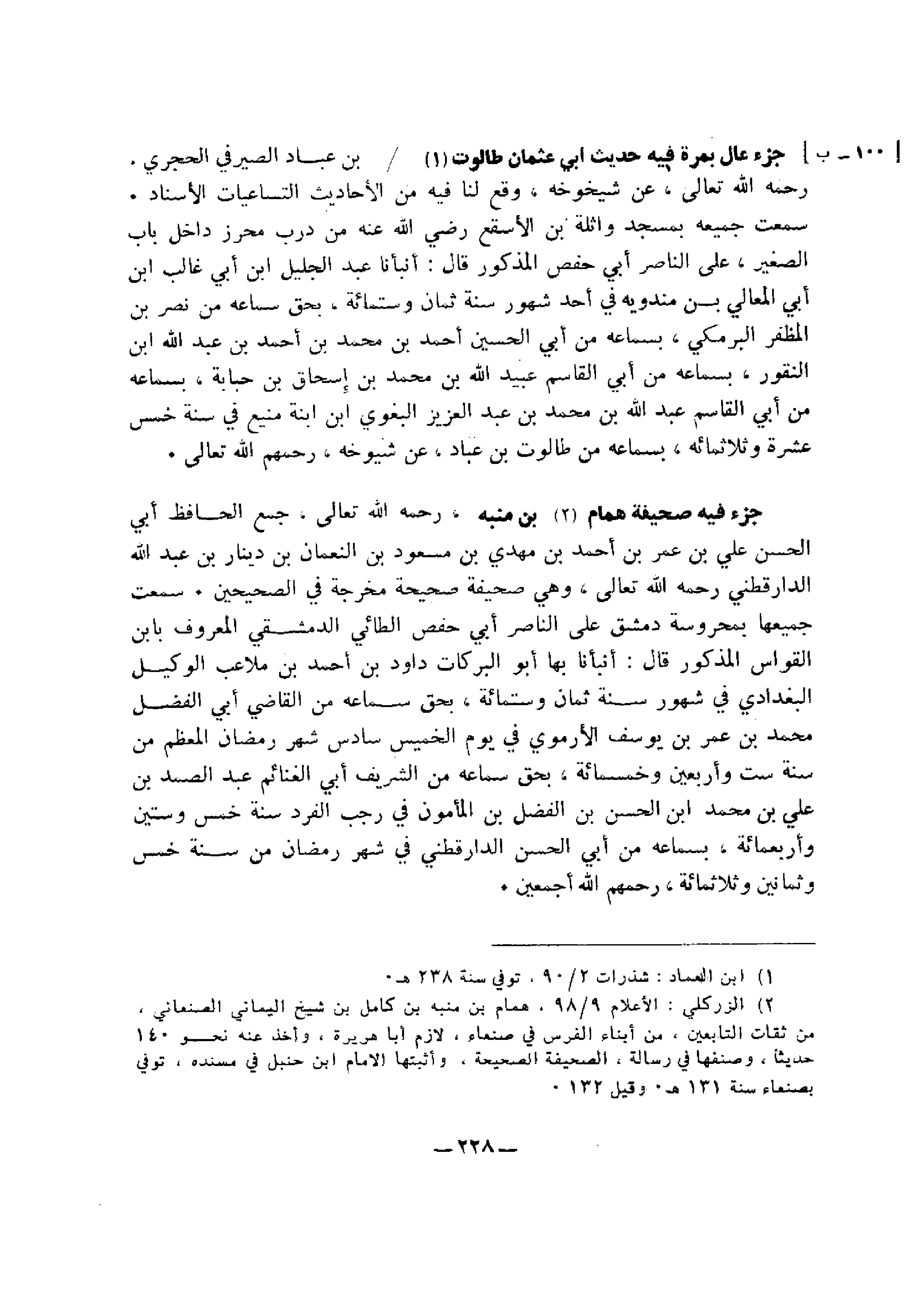 جزء فيه صحيفة همام بن منبه، رحمه الله تعالى، جمع الحافظ أبي الحسن علي بن عمر بن أحمد بن مهدي بن مسعود بن دينار بن عبد الله الدراقطني رحمه الله تعالى، وهي صحيفة صحيحة مخرجة في الصحيحين، سمع جميعها بمحروسة دمشق علي الناصر أبي حفص الطائي الدمشقي المعروف بابن القواس المذكور قال: أنبأنا بها أبو البركان داود بن أحمد بن ملاعب الوكيل البغدادي في شهور سنة ثمان وست مائة، بحق سماعه من القاضي أبي الفضل محمد بن عمر بن يوسف الأرموي في يوم الخميس سادس شر رمضان المعظم من سنة ست وأربعين وخمس مائة، بحق سماعه من الشريف أبي الغنائم عبد الصمد بن علي بن محمد ابن الحسن بن الفضل بن المأمون في رجب الفرد سنة خمس وستين وأربع مائة، بسماعه من أبي الحسن الدراقطني في شهر رمضان من سنة خمس وثمانين وثلاث مائة، رحمهم الله أجمعين.