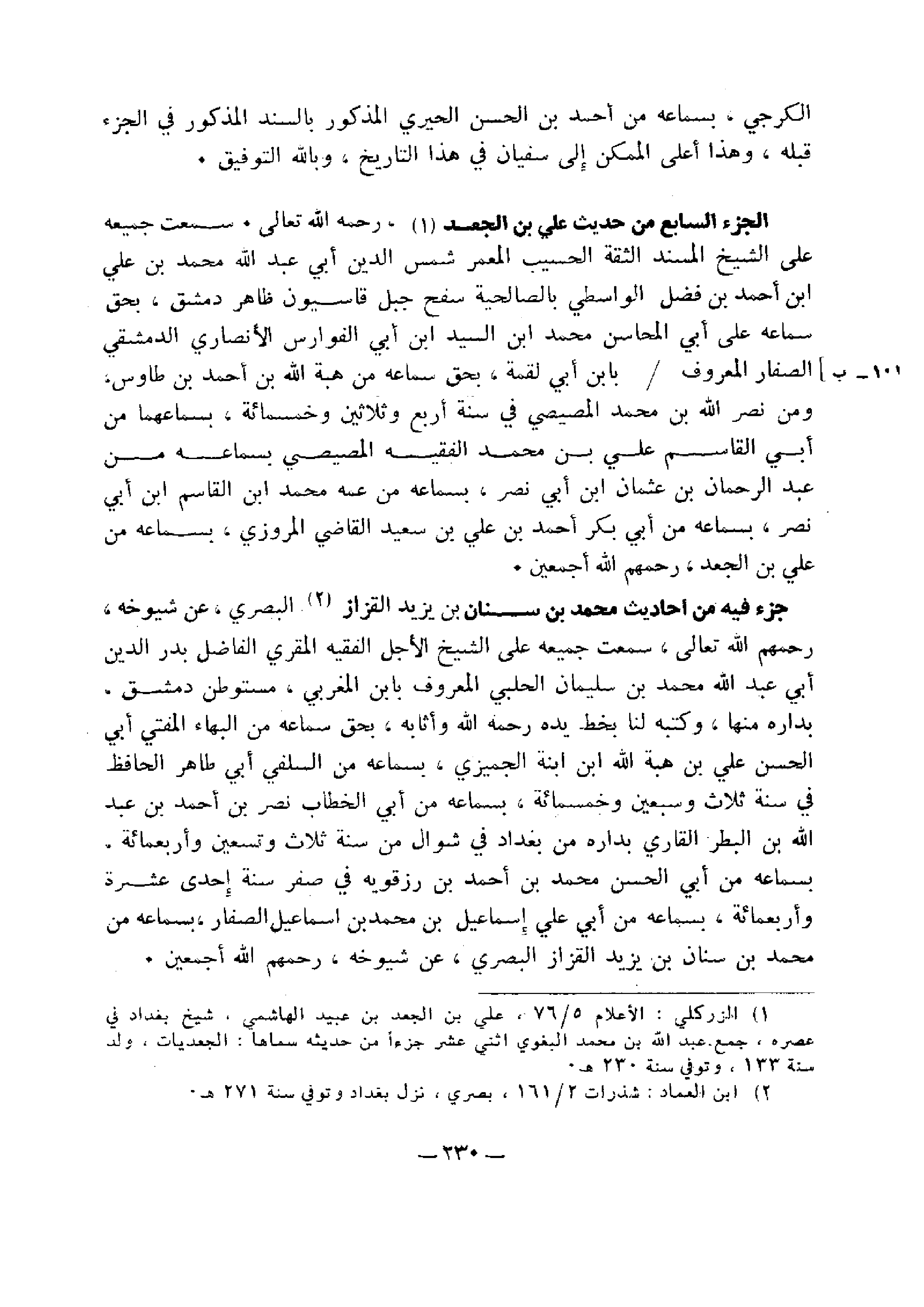 الجزء السابع من حديث علي بن الجعد، رحمه الله تعالى، سمعت جميعه على الشيخ المسند الثقة الحسيب المعمر شمس الدين أبي عبد الله محمد بن علي بن أحمد بن فضل الواسطي بالصالحية سفح جيل قاسيون ظاهر دمشق، بحق سماعه علي أبي المحاسن محمد بن السيد بن أبي الفوارس الأنصاري الدمشقي الصفار المعروف بابن أبي لقيمة، بحق سماعه من هبة الله بن أحمد بن طاوس ومن نصر الله بن محمد المصيصي في سنة أربع وثلاثين وخمس مائة، بسماعهما من أبي القاسم علي بن محمد الفقيه المصيصي بسماعه من عبد الرحمن بن عثمان بن أبي نصر، بسماعه من عمه محمد ابن القاسم ابن أبي نصر، بسماعه من أبي بكر أحمد بن علي بن سعيد القاضي المرزوي، بسماعه من علي بن الجعد، رحمهم الله أجمعين.