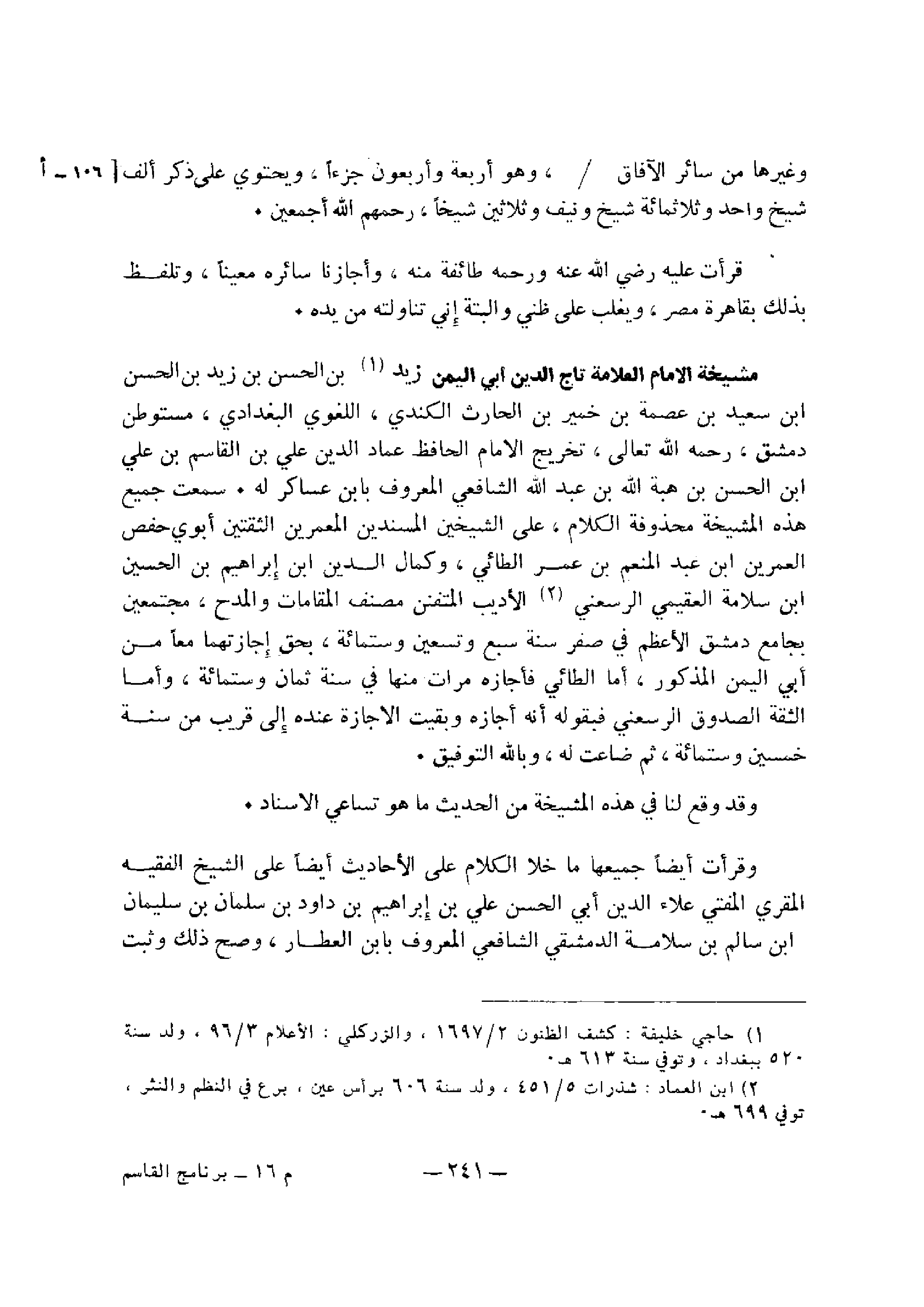 مشيخة الإمام العلامة تاج الدين أبي اليمن زيد بن الحسن بن زيد بن الحسن ابن سعيد بن عصمة بن حمير بن الحارث الكندي، اللغوي البغدادي، مستوطن دمشق، رحمه الله تعالى، تخريج الإمام الحافظ عماد الدين علي بن القاسم بن علي ابن الحسن بن هبة الله بن عبد الشافعي المعروف بابن عسكر له.