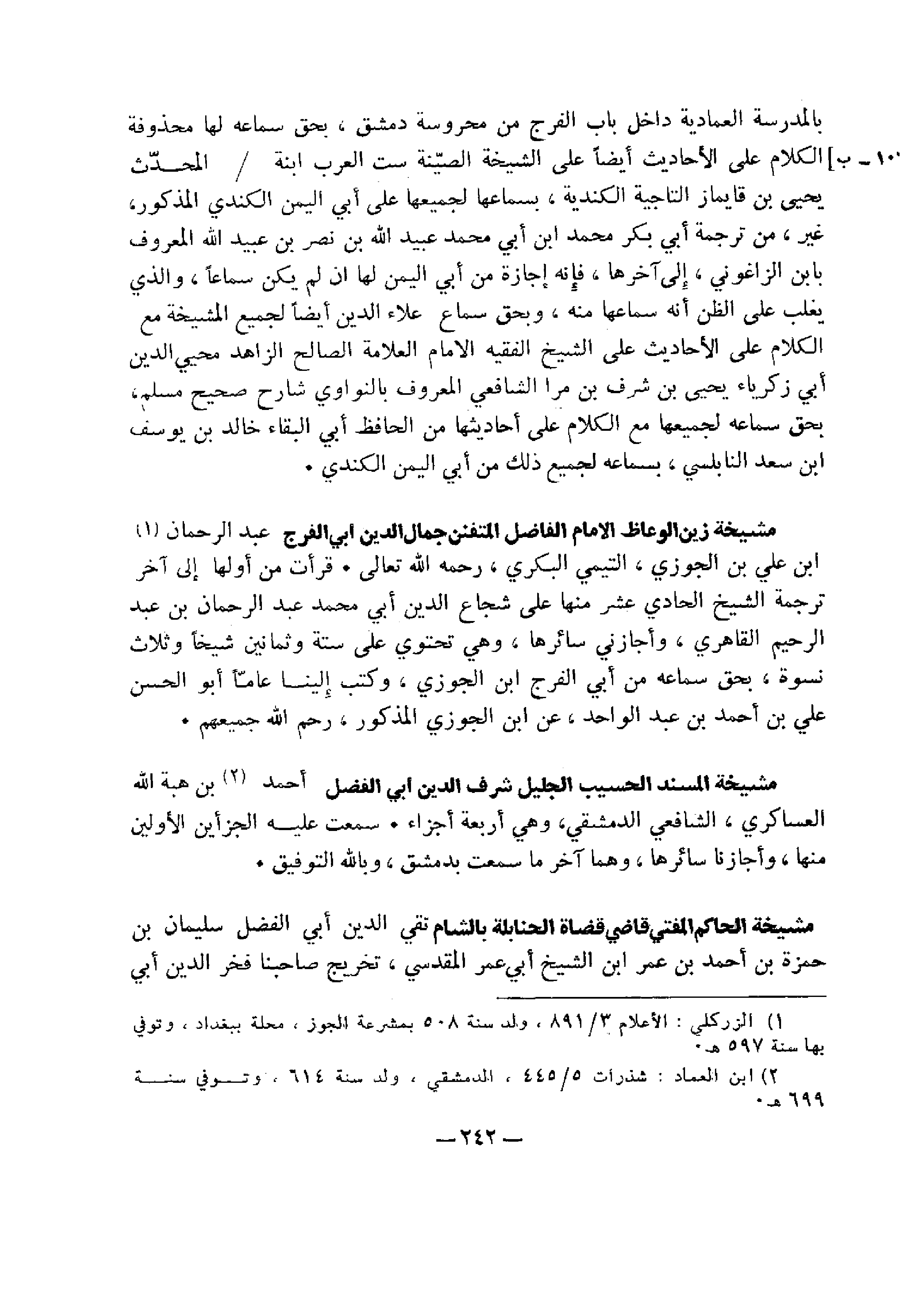 بالمدرسة العمادية داخل باب الفرج من محروسة دمشق، بحق سماعه لها محذوفة الكلام علي الأحاديث أيضًا على الشيخه الصينة ست العرب ابنة المحدث يحيى بن قايماز التاجية الكندية، بسماعها لجميعها علي أبي اليمن الكندي المذكور، غيره، عن ترجمة أبي بكر محمد ابن أبي محمد عبيد الله بن نصر بن عبيد الله المعروف بابن الزاغوني، إلى آخرها، فإنه إجازة من أبي اليمن لها أن لم يكن سماعًا، والذي يغلب علي الظن أنه سماعها منه، وبحق سماع علاء الدين أيضًا لجميع المشيخة مع الكلام علي الأحاديث على الشيخ الفقيه الإمام العلامة الصالح الزاهد محي الدين أبي زكرياء يحيى بن شرف بن مرا الشافعي المعروف بالنووي شارح صحيح مسلم، بحق سماعه لجميعها مع الكلام علي أحاديثها من الحافظ أبي البقاء خالد بن يوسف ابن سعد النابلسي، بسماعه لجميع ذلك من أبي اليمن الكندي.