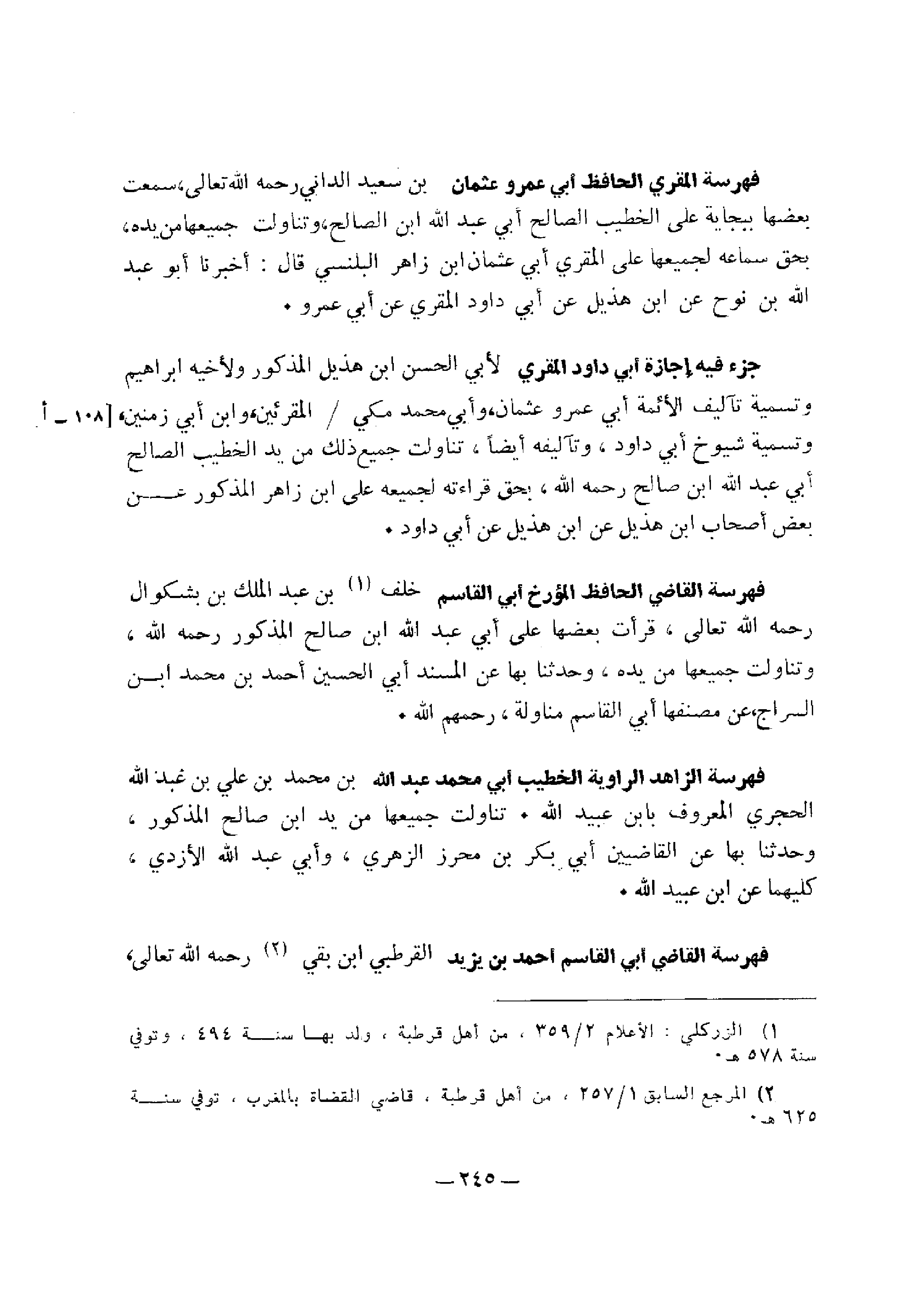 فهرسة المقري الحافظ أبي عمرو عثمان، بن سعيد الداني رحمه الله تعالى، سمعت بعضها ببجاية على الخطيب الصالح أبي عبد الله ابن الصالح، وتناولت جميعها من يده، بحق سماعه لجميعها علي المقري أبي عثمان بن زاهر البلنسي، قال: أخبرنا أبو عبد الله بن نوح، عن ابن هذيل عن أبي داود المقري، عن أبي عمرو.