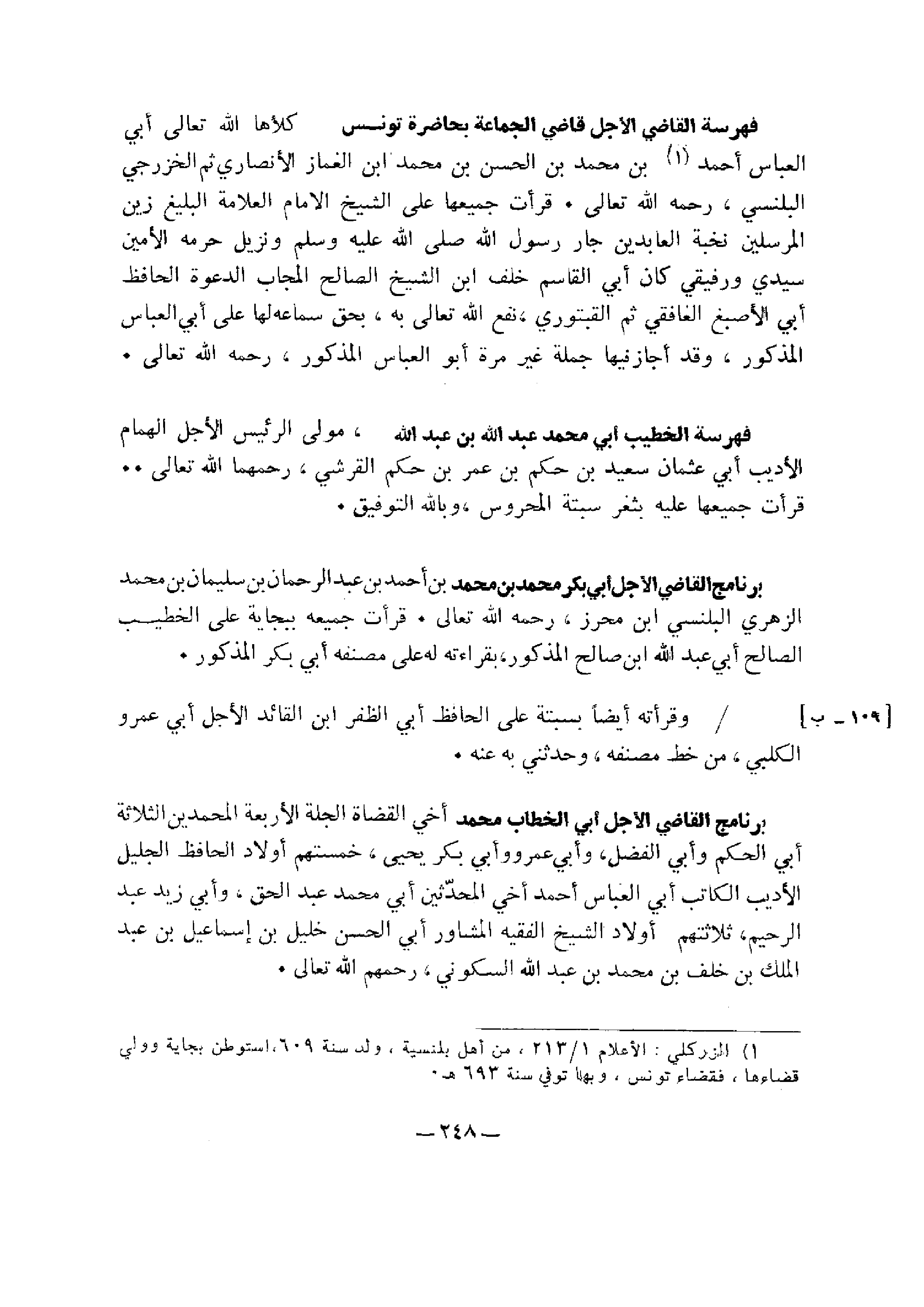 فهرسة القاضي الأجل قاضي الجماعة بحاضرة تونس كلأها الله تعالى أبي العباس أحمد بن محمد بن الحسن بن محمد ابن الغماز الأنصاري ثم الخزرجي البلنسي، رحمه الله تعالى.