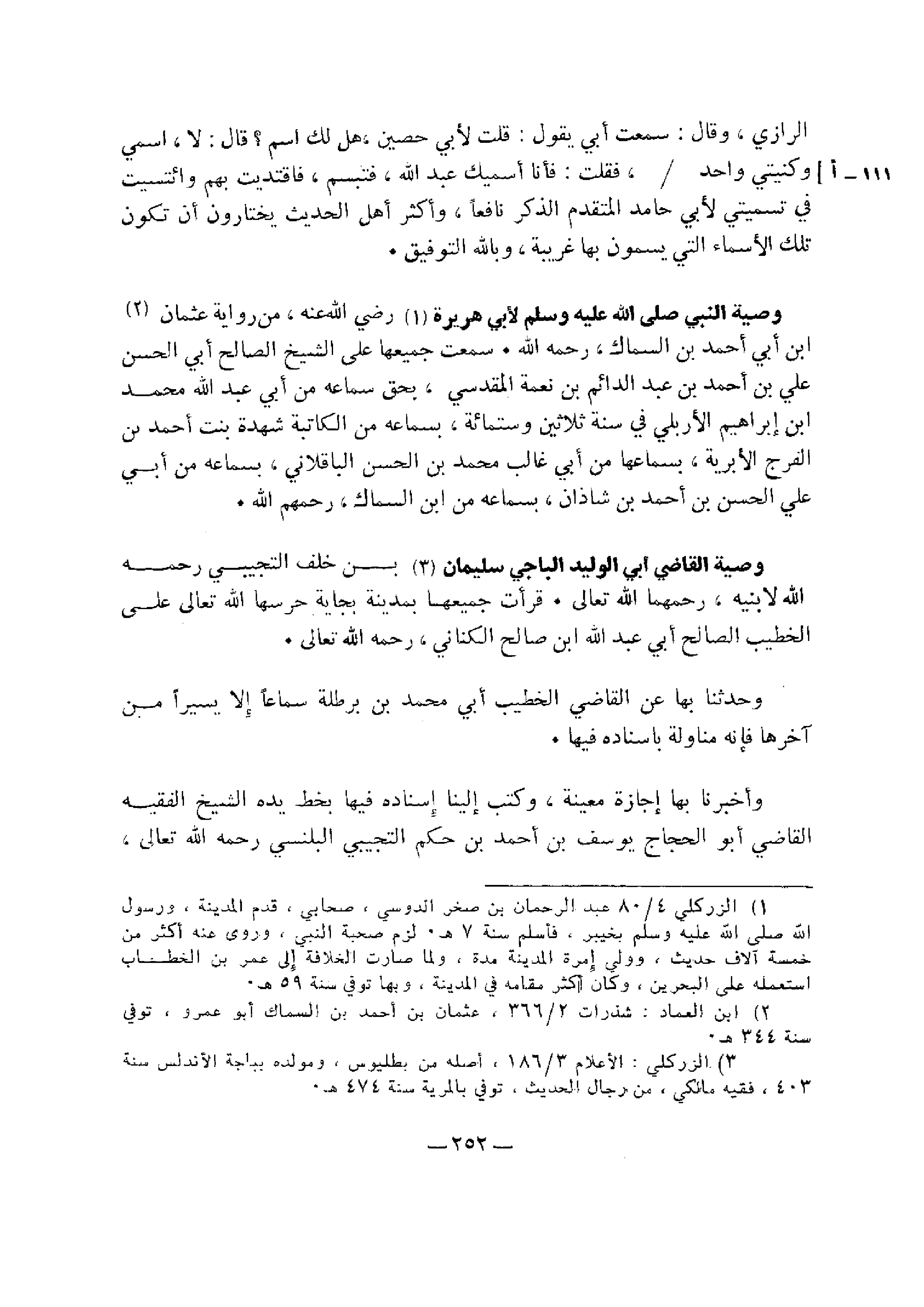 وصية النبي صلى الله عليه وسلم لأبي هريرة، رضي الله عنه، من رواية عثمان ابن أبي أحمد بن السماك، رحمه الله , سمعت جميعها على الشيخ الصالح أبي الحسن علي بن أحمد بن عبد الدائم بن نعمة المقدسي، بحق سماعه من أبي عبد الله محمد بن إبراهيم الأربلي في سنة ثلاثين وست مائة، بسماعه من الكاتبة شهدة بنت أحمد بن الفرج الأبرية، بسماعها من أبي غالب محمد بن الحسن الباقلاني، بسماعه من أبي علي الحسن بن أحمد بن شاذان، بسماعه من ابن السماك، رحمهم الله.