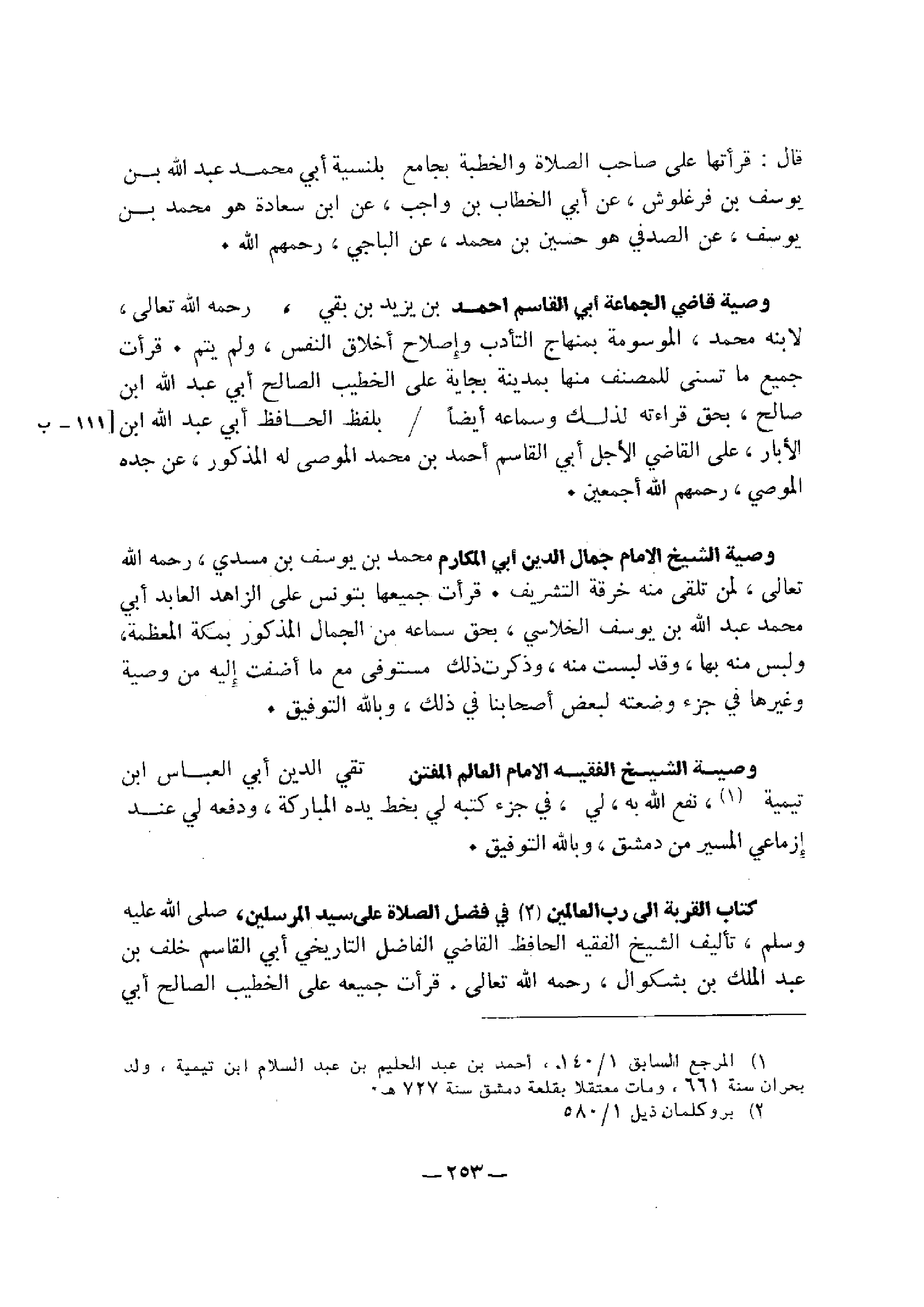 قرأت جميع ما تسني للمصنف منها بمدينة بجاية على الخطيب الصالح أبي عبد الله ابن صالح، بحق قراءته لذلك وسماعه أيضًا، بلفظ الحافظ أبي عبد الله بن الأبار، على القاضي الأجل أبي القاسم احمد بن محمد الموصي له المذكور، عن جده الموصي، رحمهم الله أجمعين.