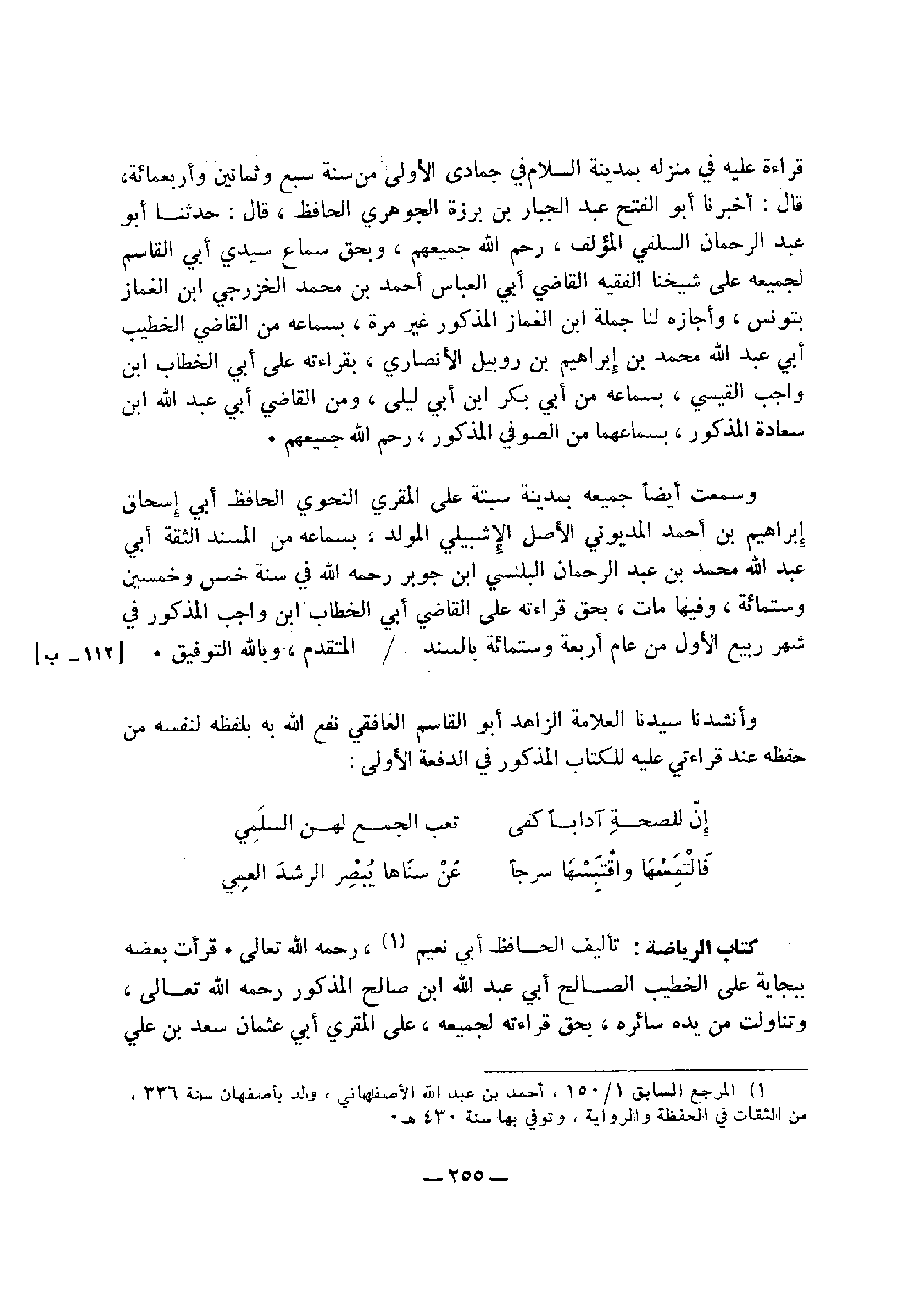 قراءة عليه في منزله بمدينة السلام في جمادي الأولي من سنة سبع وثمانين وأربع مائة، قال: حدثنا أبو عبد الرحمن السلفي المؤلف، رحم الله جميعهم، وبحق سماع سيدي أبي القاسم لجميعه على شيخنا الفقيه القاضي أبي العباس أحمد بن محمد الخزرجي ابن الغماز بتونس، وأجازه لنا جمله ابن الغماز المذكور غير مرة، بسماعه من القاضي الخطيب أبي عبد الله محمد بن إبراهيم بن روبيل الأنصاري، بقراءته على أبي الخطاب بن واجب القيسي، بسماعه من أبي بكر بن أبي ليلي، ومن القاضي أبي عبد الله بن سعادة المذكور، بسماعهما من الصوفي، رحم الله جميعهم.
