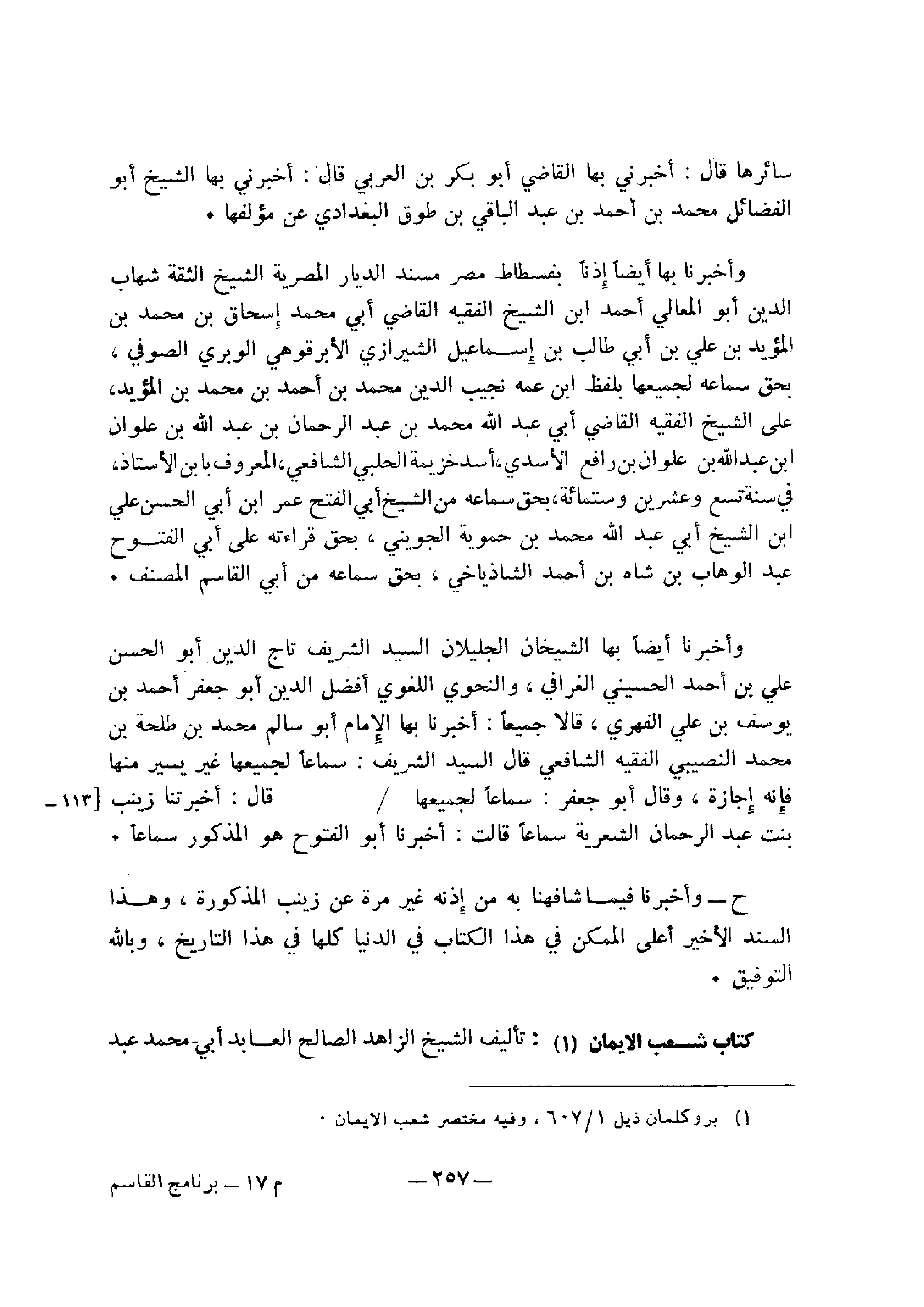 وأخبرنا أيضًا به الشيخان الجليلان السيد الشريف تاج الدين أبو الحسن علي بن أحمد الحسيني الغرافي، والنحوي اللغوي أفضل الدين أبو جعفر أحمد بن يوسف بن علي الفهري، قالا جميعًا أخبرنا بها الإمام أبو سالم محمد بن طلحة بن محمد النصيبي الفقيه الشافعي , قال السيد الشريف: سماعًا لجميعها غير يسير منها فإنه إجازة، وقال أبو جعفر: سماعًا لجميعها , قال: أخبرتنا زينب بنت عبد الرحمن الشعرية سماعًا , قال: أخبرنا أبو الفتوح هو المذكور سماعًا. . ح وأخبرنا فيما شافهنا به من إذنه غير مرة , عن زينب المذكورة، وهذا السند الأخير أعلى الممكن في هذا الكتاب في الدنيا كلها في هذا التاريخ، وبالله التوفيق.