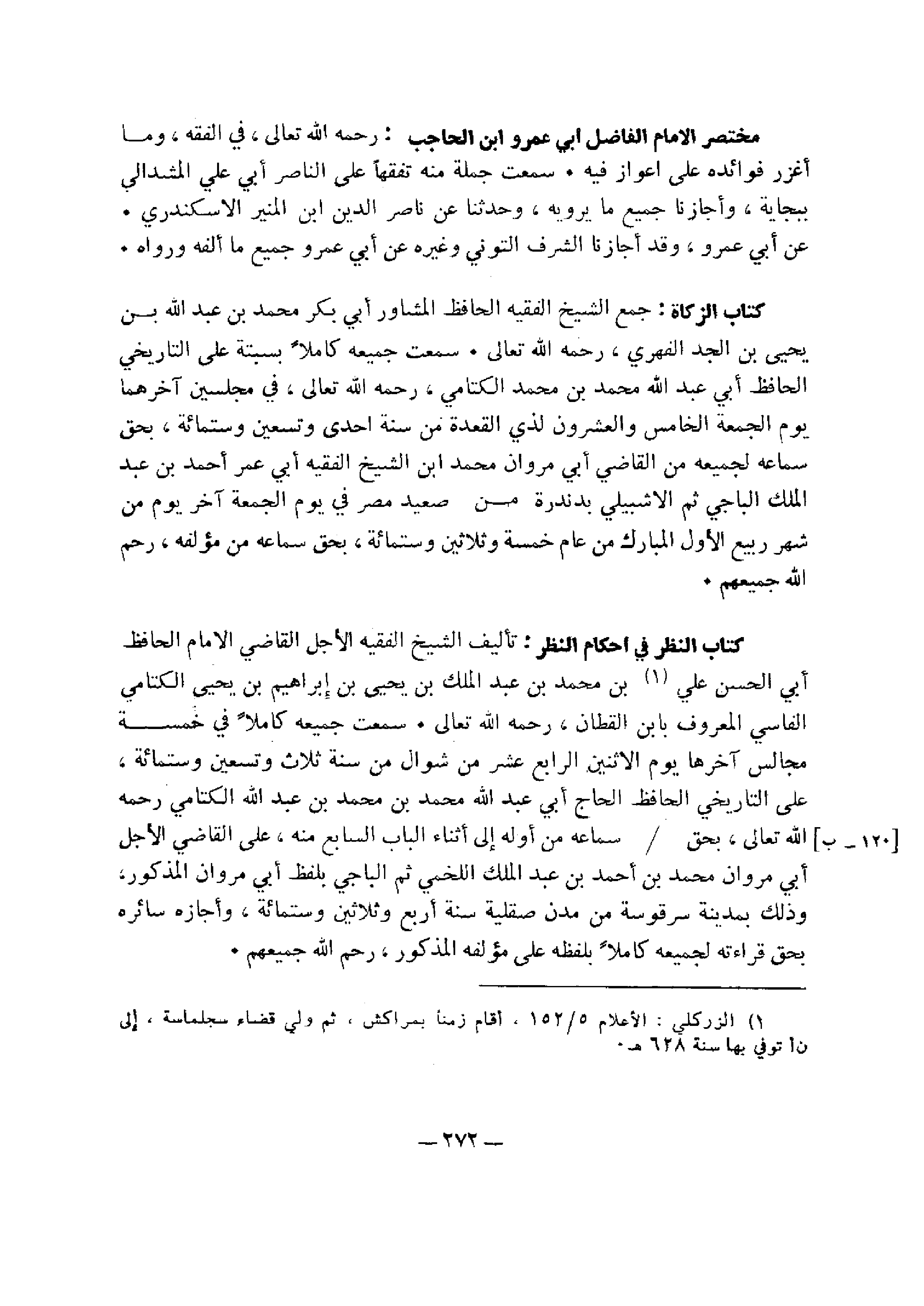 سمعت جميعه كاملاً بسبته على التاريخي الحافظ أبي عبد الله محمد بن محمد الكتامي، رحمه الله تعالى، في مجلسين آخرهما يوم الجمعة الخامس والعشرون لذي القعدة من سنة إحدى وتسعين وست مائة، بحق سماعه لجميعه من القاضي أبي مروان محمد بن الشيخ الفقيه أبي عمر أحمد بن عبد الملك الباجي، ثم الإشبيلي بدندرة من صعيد مصر في يوم الجمعة آخر يوم من شهر ربيع الأول المبارك من عام خمسة وثلاثين وست مائة، بحق سماعه من مؤلفه، رحم الله جميعهم.