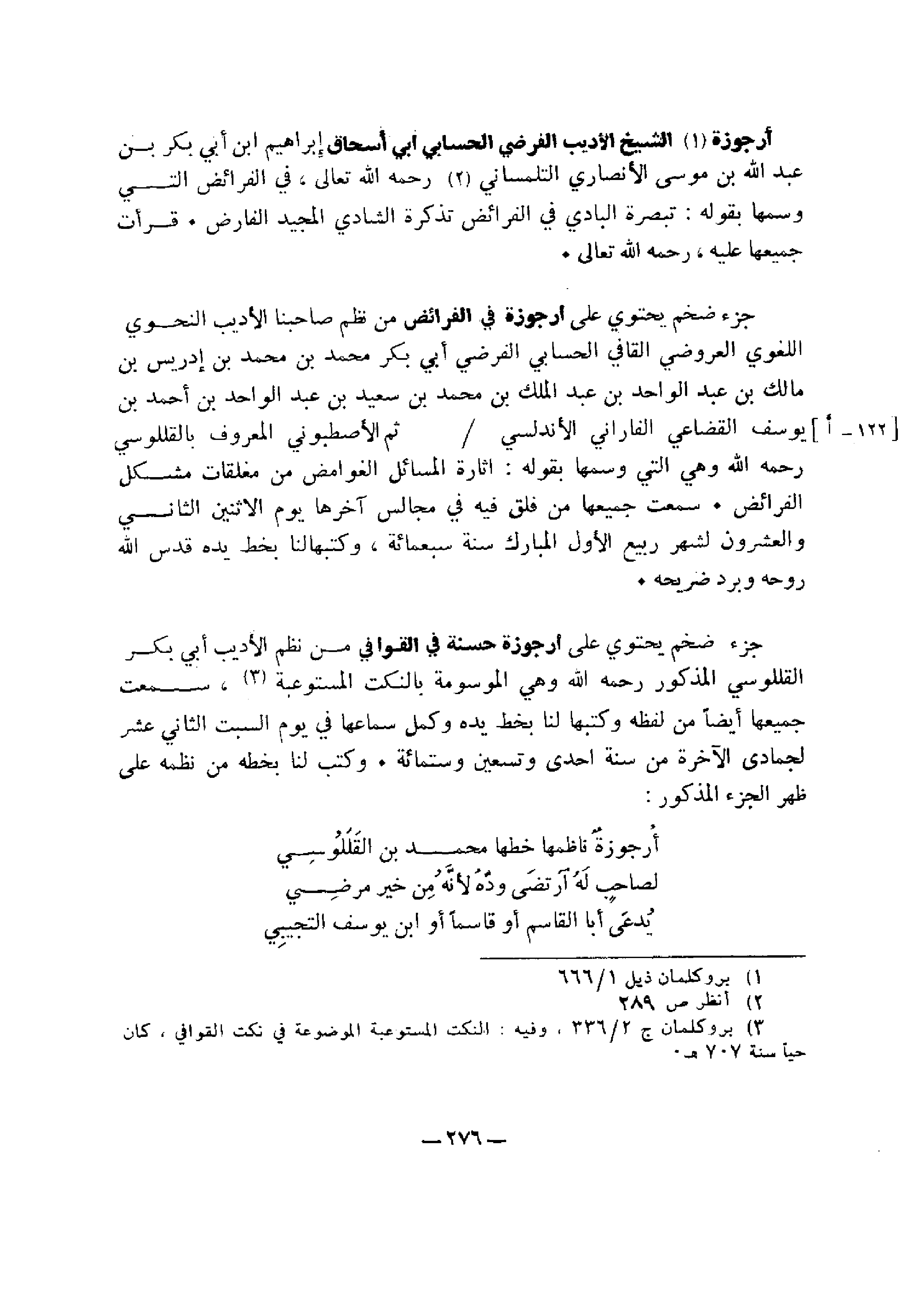 جزء ضخم يحتوي على أرجوزة في الفرائض من نظم صاحبنا الأديب النحوي اللغوي العروضي القافي الحسابي الفرضي أبي بكر محمد بن محمد بن إدريس بن مالك بن عبد الواحد بن عبد الملك بن محمد بن عبد الملك بن محمد بن سعيد بن عبد الواحد بن أحمد بن يوسف القضاعي الفاراني الأندلسي ثم الأصطبوني المعروف بالقللوسي رحمه الله وهي التي وسمها بقوله: إثارة المسائل الغوامض من مغلقات مشكل الفرائض.