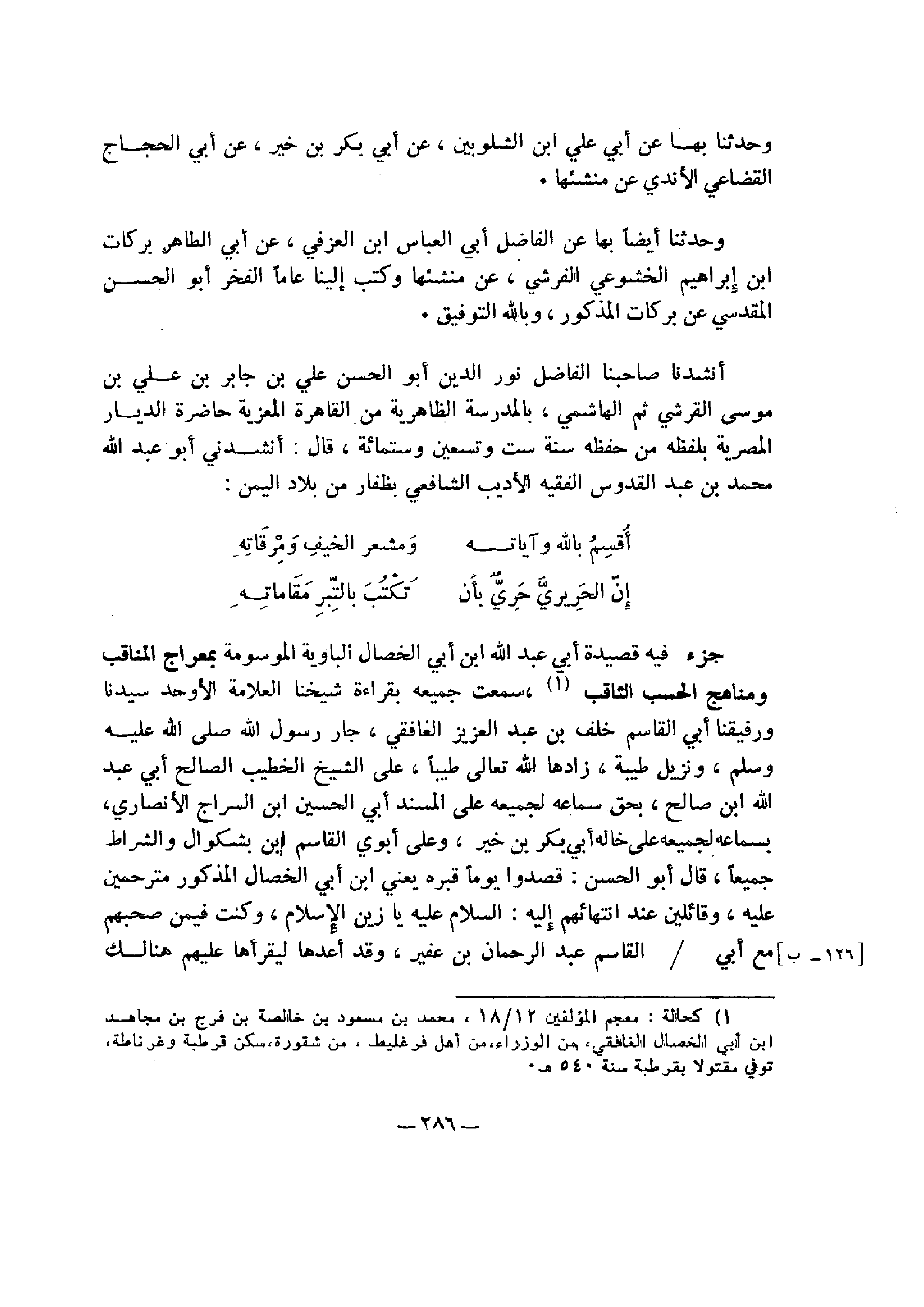 جزء فيه قصيدة أبي عبد الله ابن أبي الخصال الباوية الموسومة بمعراج المناقب ومناهج الحسب الثاقب، سمعت جميعه بقراءة شيخنا العلامة الأوحد سيدنا ورقينا أبي القاسم خلف بن عبد العزيز الغافقي، جار رسول الله صلي الله عليه وسلم، ونزل طيبة، زادها الله تعالى طيبًا، على الشيخ الخطيب الصالح أبي عبد الله ابن صالح بحق سماعه لجميعه على المسند أبي الحسين ابن السراج الأنصاري، بسماعه لجميعه على خاله أبي بكر بن خير، وعلى أبوي القاسم ابن بشكوال , والشراط جميعًا، قال أبو الحسن: قصدوا يومًا قبره يعني ابن أبي الخصال المذكور مترحمين عليه، وقائلين عند انتهاءهم إليه، السلام عليه يا زين الإسلام، وكنت فيمن صبحهم مع أبي القاسم عبد الرحمن بن عفير، وقد أعدها ليقرأها عليهم هنالك
