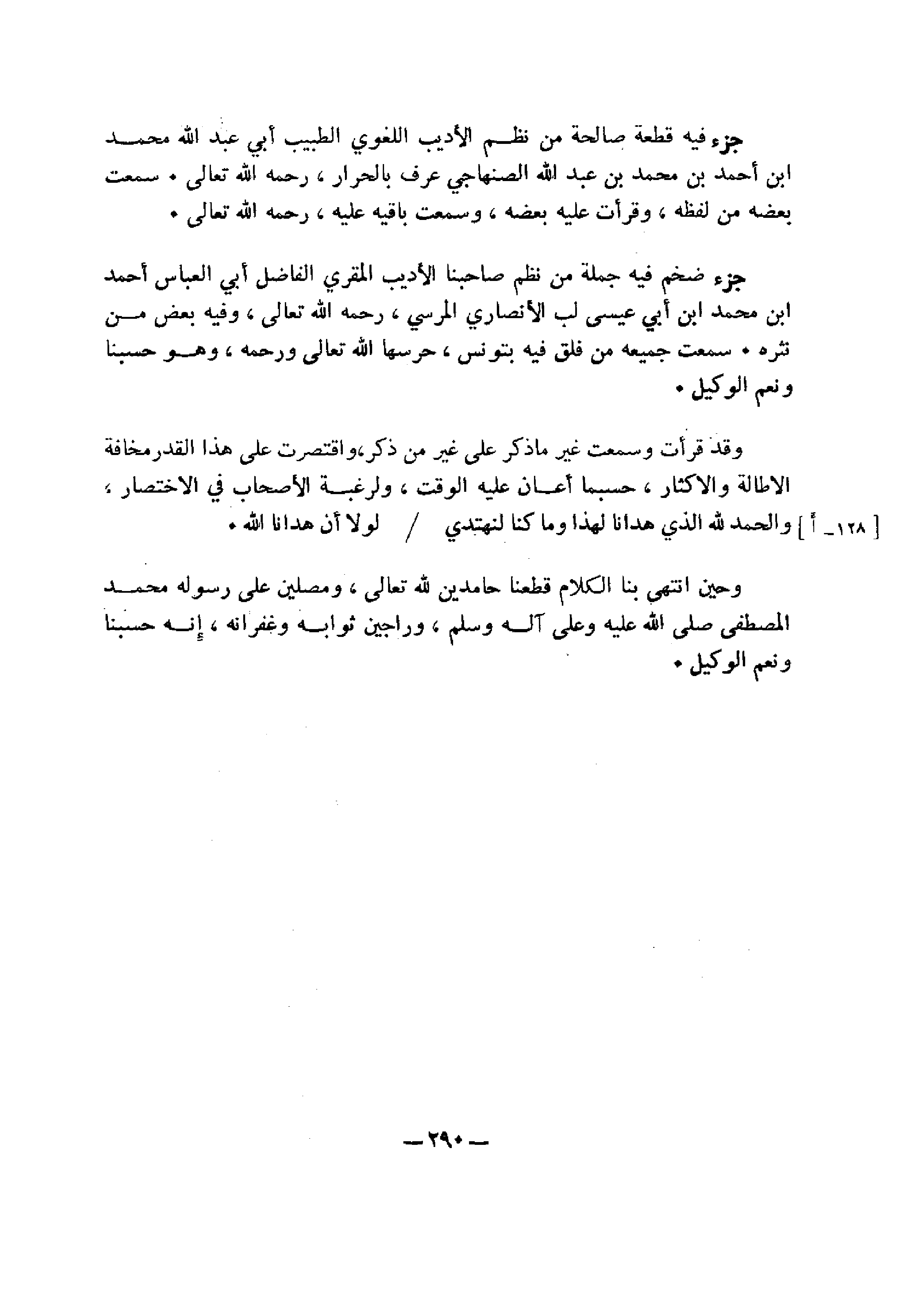 وقد قرأت وسمعت غير ما ذكر من ذكر، واقتصرت على هذا القدر مخالفة الإطالة والإكثار، حسبما أعان عليه الوقت، ولرغبة الأصحاب في الاختصار، والحمد لله الذي هدانا لهذا , وما كنا لنهتدي لولا أن هدانا الله