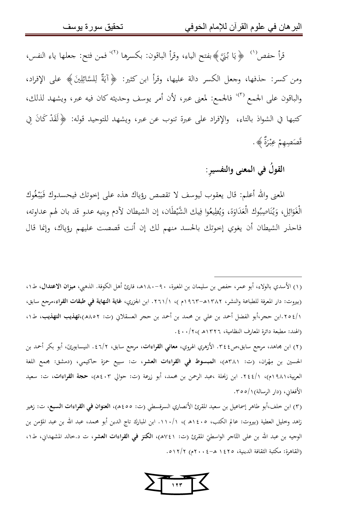قرأ حفص (¬1) {يَا بُنَيَّ} بفتح الياء, وقرأ الباقون: بكسرها (¬2)، فمن فتح: جعلها ياء النفس, ومن كسر: حذفها, وجعل الكسر دالة عليها, وقرأ ابن كثير: {آيَةٌ لِلسَّائِلِينَ} على الإفراد, والباقون على الجمع (¬3)، فالجمع: لمعنى عبر, لأن أمر يوسف وحديثه كان فيه عبر, ويشهد لذلك, كتبها في الشواذ بالتاء، والإفراد على عبرة تنوب عن عبر, ويشهد للتوحيد قوله: {لَقَدْ كَانَ فِي قَصَصِهِمْ عِبْرَةٌ}.