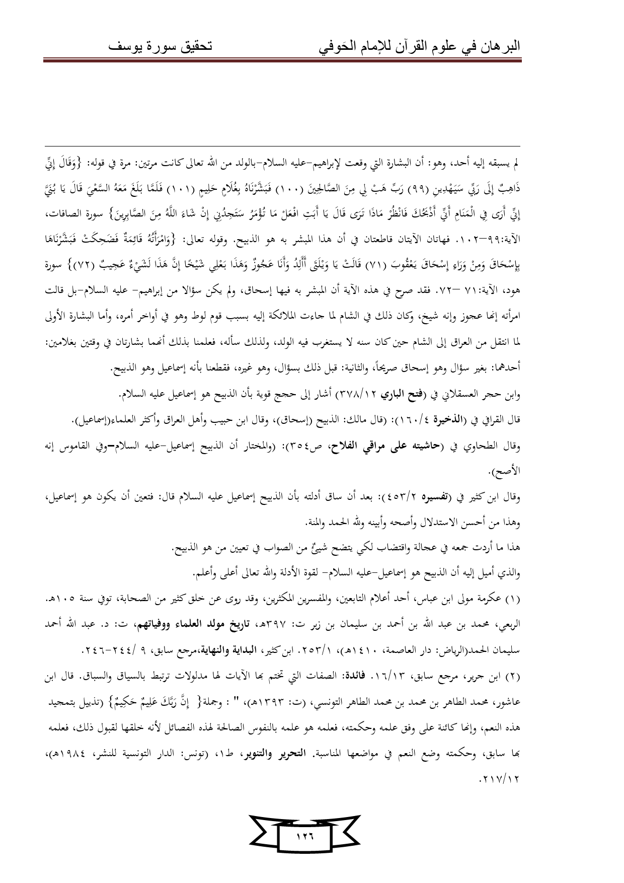 = لم يسبقه إليه أحد، وهو: أن البشارة التي وقعت لإبراهيم-عليه السلام-بالولد من الله تعالى كانت مرتين: مرة في قوله: {وَقَالَ إِنِّي ذَاهِبٌ إِلَى رَبِّي سَيَهْدِينِ (99) رَبِّ هَبْ لِي مِنَ الصَّالِحِينَ (100) فَبَشَّرْنَاهُ بِغُلَامٍ حَلِيمٍ (101) فَلَمَّا بَلَغَ مَعَهُ السَّعْيَ قَالَ يَا بُنَيَّ إِنِّي أَرَى فِي الْمَنَامِ أَنِّي أَذْبَحُكَ فَانْظُرْ مَاذَا تَرَى قَالَ يَا أَبَتِ افْعَلْ مَا تُؤْمَرُ سَتَجِدُنِي إِنْ شَاءَ اللَّهُ مِنَ الصَّابِرِينَ} سورة الصافات، الآية: (99) - (102). فهاتان الآيتان قاطعتان في أن هذا المبشر به هو الذبيح. وقوله تعالى: {وَامْرَأَتُهُ قَائِمَةٌ فَضَحِكَتْ فَبَشَّرْنَاهَا بِإِسْحَاقَ وَمِنْ وَرَاءِ إِسْحَاقَ يَعْقُوبَ (71) قَالَتْ يَا وَيْلَتَى أَأَلِدُ وَأَنَا عَجُوزٌ وَهَذَا بَعْلِي شَيْخًا إِنَّ هَذَا لَشَيْءٌ عَجِيبٌ (72)} سورة هود، الآية: (71) - (72). فقد صرح في هذه الآية أن المبشر به فيها إسحاق، ولم يكن سؤالا من إبراهيم- عليه السلام-بل قالت امرأته إنها عجوز وإنه شيخ، وكان ذلك في الشام لما جاءت الملائكة إليه بسبب قوم لوط وهو في أواخر أمره، وأما البشارة الأولى لما انتقل من العراق إلى الشام حين كان سنه لا يستغرب فيه الولد، ولذلك سأله، فعلمنا بذلك أنهما بشارتان في وقتين بغلامين: أحدهما: بغير سؤال وهو إسحاق صريحاً، والثانية: قبل ذلك بسؤال، وهو غيره، فقطعنا بأنه إسماعيل وهو الذبيح.