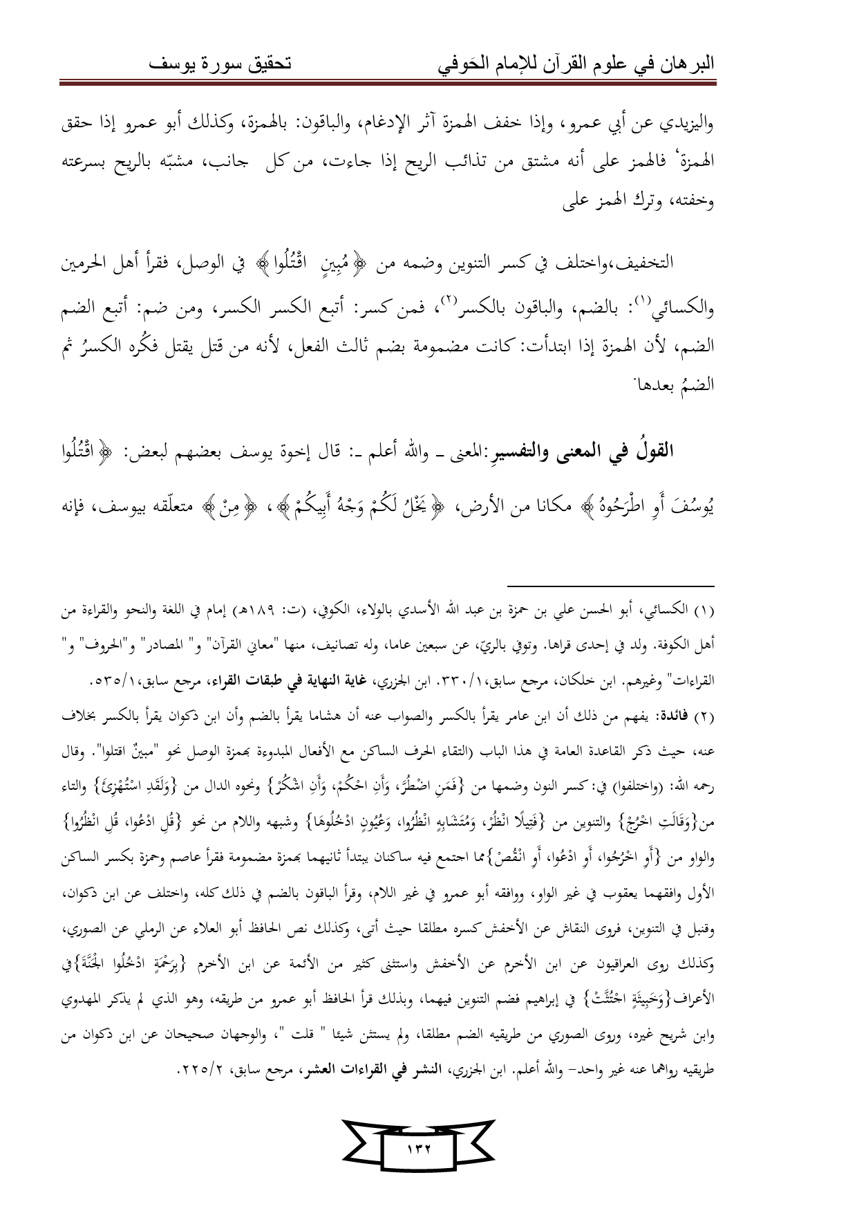 التخفيف, واختلف في كسر التنوين وضمه من {مُبِينٍ اقْتُلُوا} في الوصل, فقرأ أهل الحرمين والكسائي (¬1): بالضم, والباقون بالكسر (¬2)