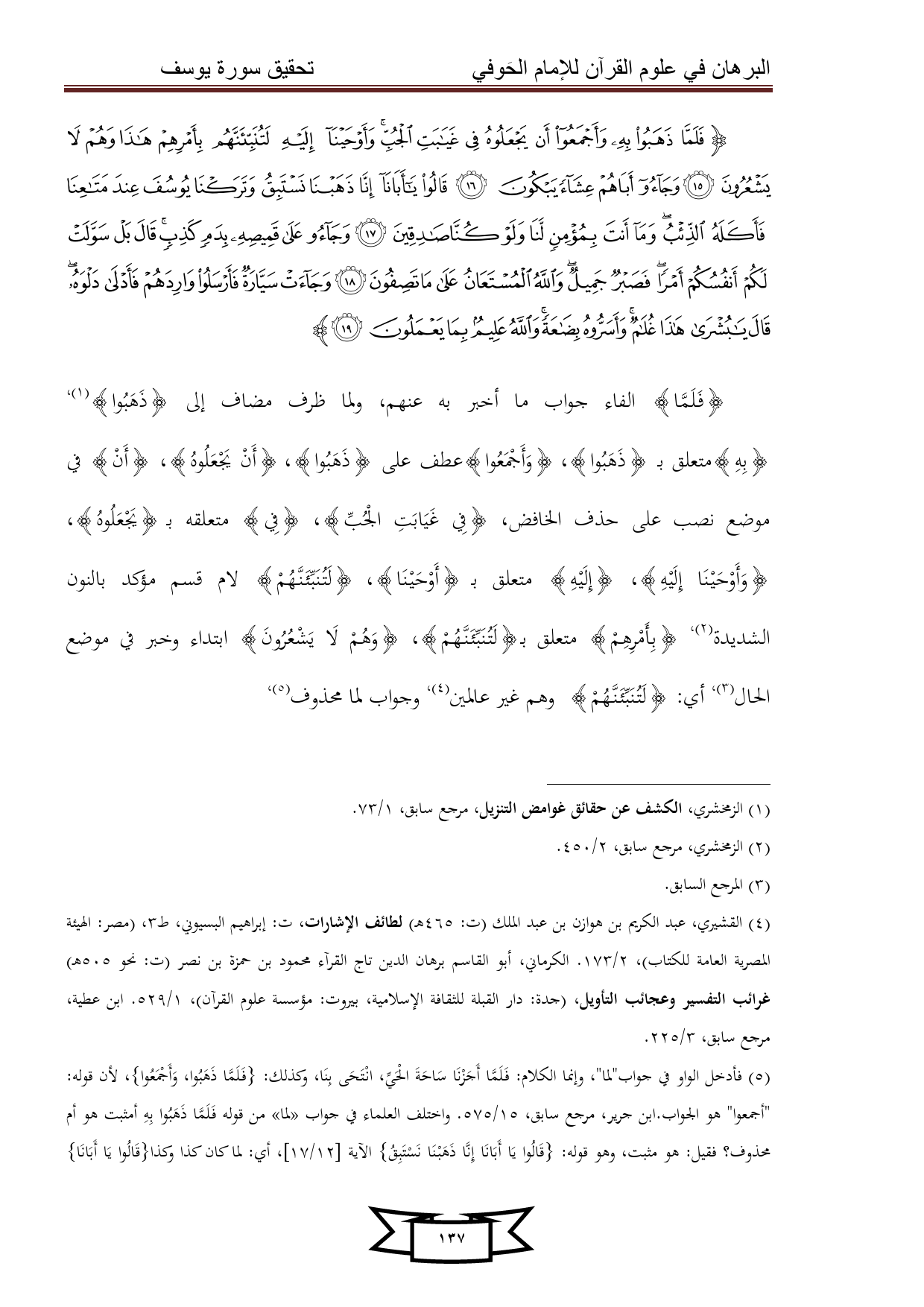 (¬5) فأدخل الواو في جواب"لما"، وإنما الكلام: فَلَمَّا أَجَزْنَا سَاحَةَ الْحَيِّ، انْتَحَى بِنَا، وكذلك: {فَلَمَّا ذَهَبُوا، وَأَجْمَعُوا}، لأن قوله: "أجمعوا" هو الجواب. ابن جرير، مرجع سابق، 15/ 575. واختلف العلماء في جواب «لما» من قوله فَلَمَّا ذَهَبُوا بِهِ أمثبت هو أم محذوف؟ فقيل: هو مثبت، وهو قوله: {قَالُوا يَا أَبَانَا إِنَّا ذَهَبْنَا نَسْتَبِقُ} الآية [12/ 17]، أي: لما كان كذا وكذا {قَالُوا يَا أَبَانَا} واستحسن هذا الوجه أبو حيان .. وقيل: جواب «لما» هو قوله: أوحينا والواو صلة، وهذا مذهب الكوفيين، تزاد عندهم الواو في جواب «لما، وحتى، وإذا»، وعلى ذلك خرجوا قوله تعالى: {فَلَمَّا أَسْلَمَا وَتَلَّهُ لِلْجَبِينِ وَنَادَيْنَاهُ}، الصافات، الآية: 103، 104. وقوله تعالى: {حَتَّى إِذَا جَاءُوهَا وَفُتِحَتْ أَبْوَابُهَا}، الزمر، الآية: 73، وقولَ امرئِ القيس: