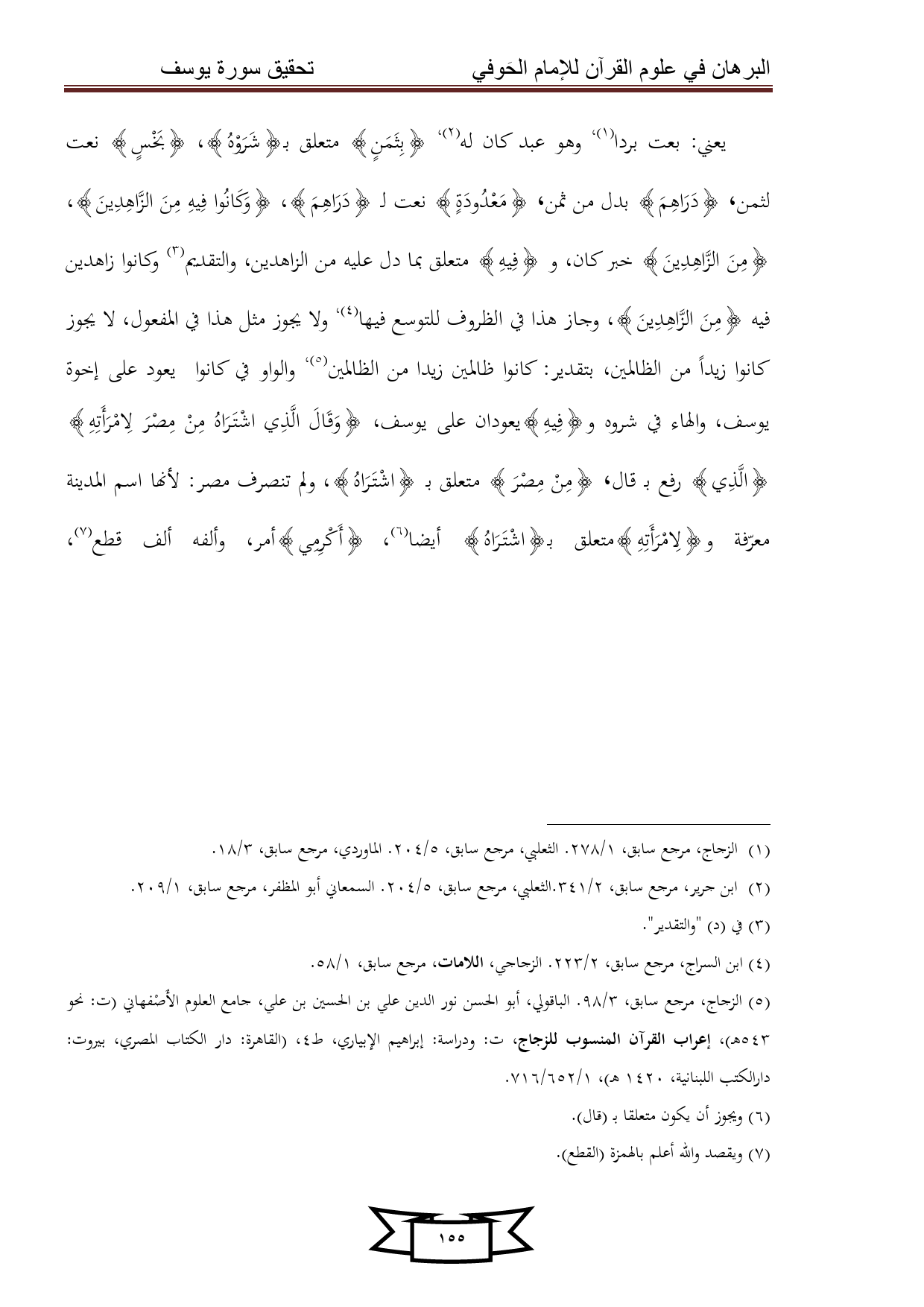 (¬5) الزجاج، مرجع سابق، 3/ 98. الباقولي، أبو الحسن نور الدين علي بن الحسين بن علي، جامع العلوم الأَصْفهاني (ت: نحو 543 هـ)، إعراب القرآن المنسوب للزجاج، ت: ودراسة: إبراهيم الإبياري، ط 4، (القاهرة: دار الكتاب المصري، بيروت: دارالكتب اللبنانية، 1420 هـ)، 1/ 652/716.