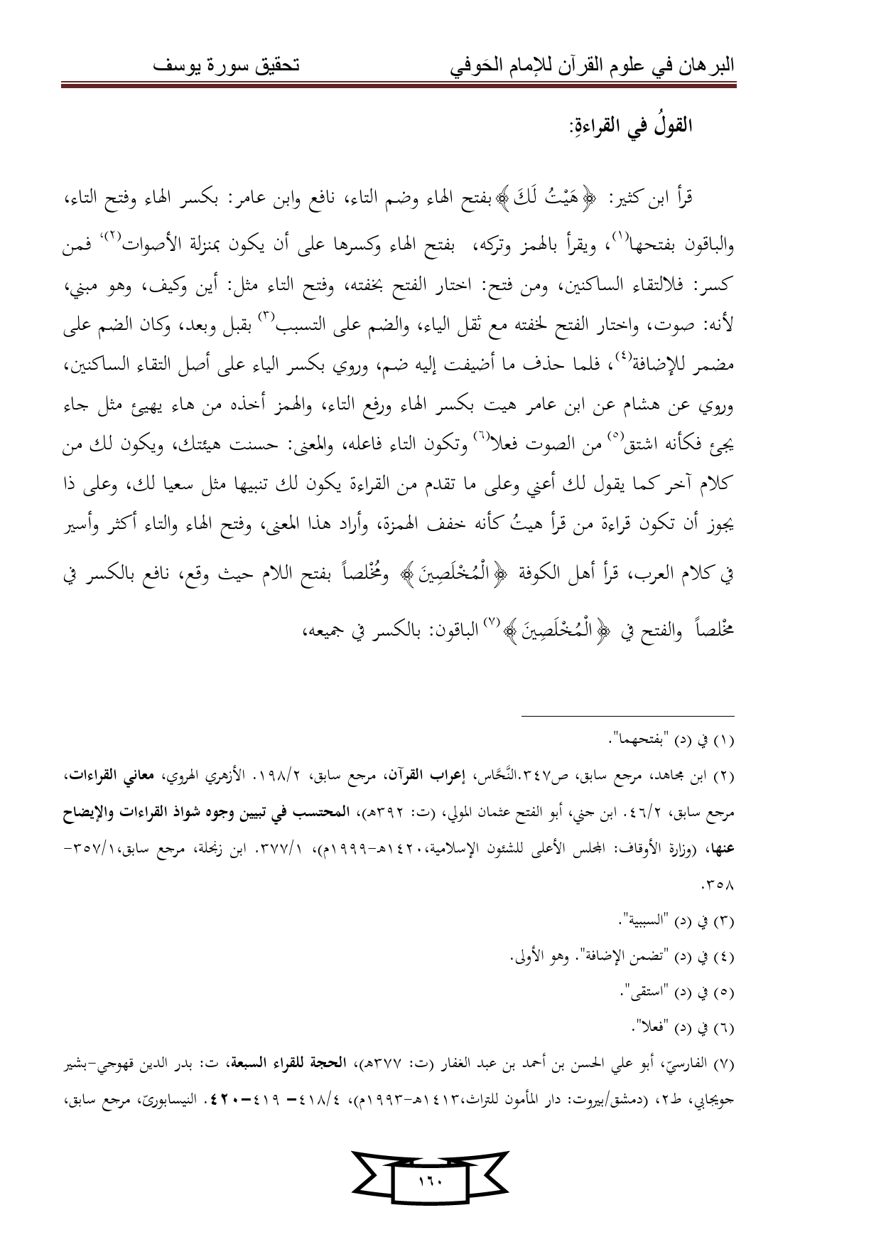 كتاب البرهان في علوم القرآن للإمام الحوفي - سورة يوسف