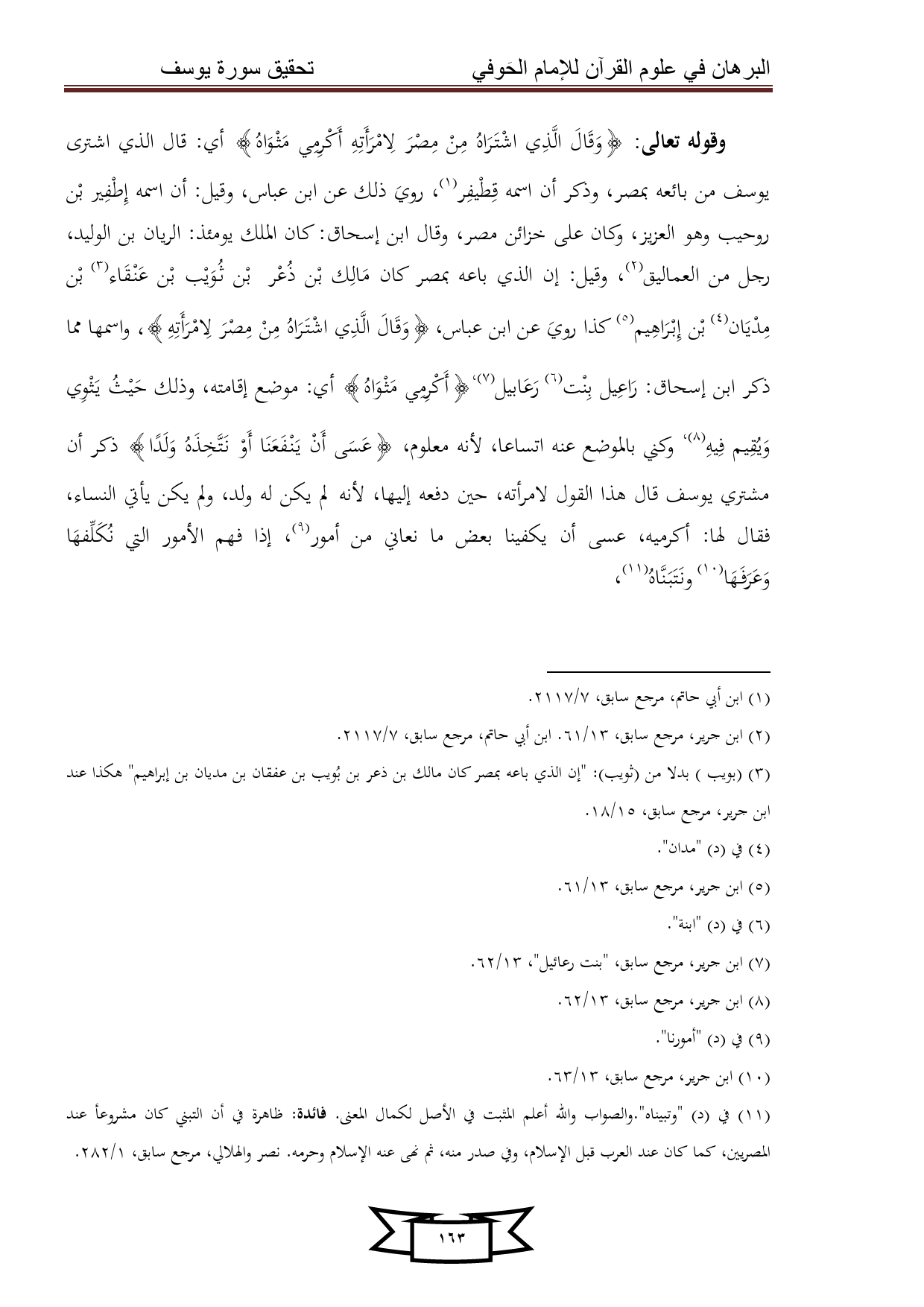 وقوله تعالى: {وَقَالَ الَّذِي اشْتَرَاهُ مِنْ مِصْرَ لِامْرَأَتِهِ أَكْرِمِي مَثْوَاهُ} أي: قال الذي اشترى يوسف من بائعه بمصر, وذكر أن اسمه قِطْيفِر (¬1)، رويَ ذلك عن ابن عباس، وقيل: أن اسمه إِطْفِير بْن روحيب وهو العزيز, وكان على خزائن مصر, وقال ابن إسحاق: كان الملك يومئذ: الريان بن الوليد, رجل من العماليق (¬2) , وقيل: إن الذي باعه بمصر كان مَالِك بْن ذُعْر بْن ثُوَيْب بْن عَنْقَاء (¬3) بْن مِدْيَان (¬4) بْن إِبْرَاهِيم (¬5) كذا رويَ عن ابن عباس, {وَقَالَ الَّذِي اشْتَرَاهُ مِنْ مِصْرَ لِامْرَأَتِهِ}، واسمها مما ذكر ابن إسحاق: رَاعِيل بِنْت (¬6) رَعَابيل (¬7)، {أَكْرِمِي مَثْوَاهُ} أي: موضع إقامته, وذلك حَيْثُ يَثْوِي وَيُقِيم فِيهِ (¬8)، وكني بالموضع عنه اتساعا, لأنه معلوم, {عَسَى أَنْ يَنْفَعَنَا أَوْ نَتَّخِذَهُ وَلَدًا} ذكر أن مشتري يوسف قال هذا القول لامرأته, حين دفعه إليها, لأنه لم يكن له ولد, ولم يكن يأتي النساء, فقال لها: أكرميه, عسى أن يكفينا بعض ما نعاني من أمور (¬9) , إذا فهم الأمور التي نُكَلِّفهَا وَعَرَفَهَا (¬10) ونَتَبَنَّاهُ (¬11)،