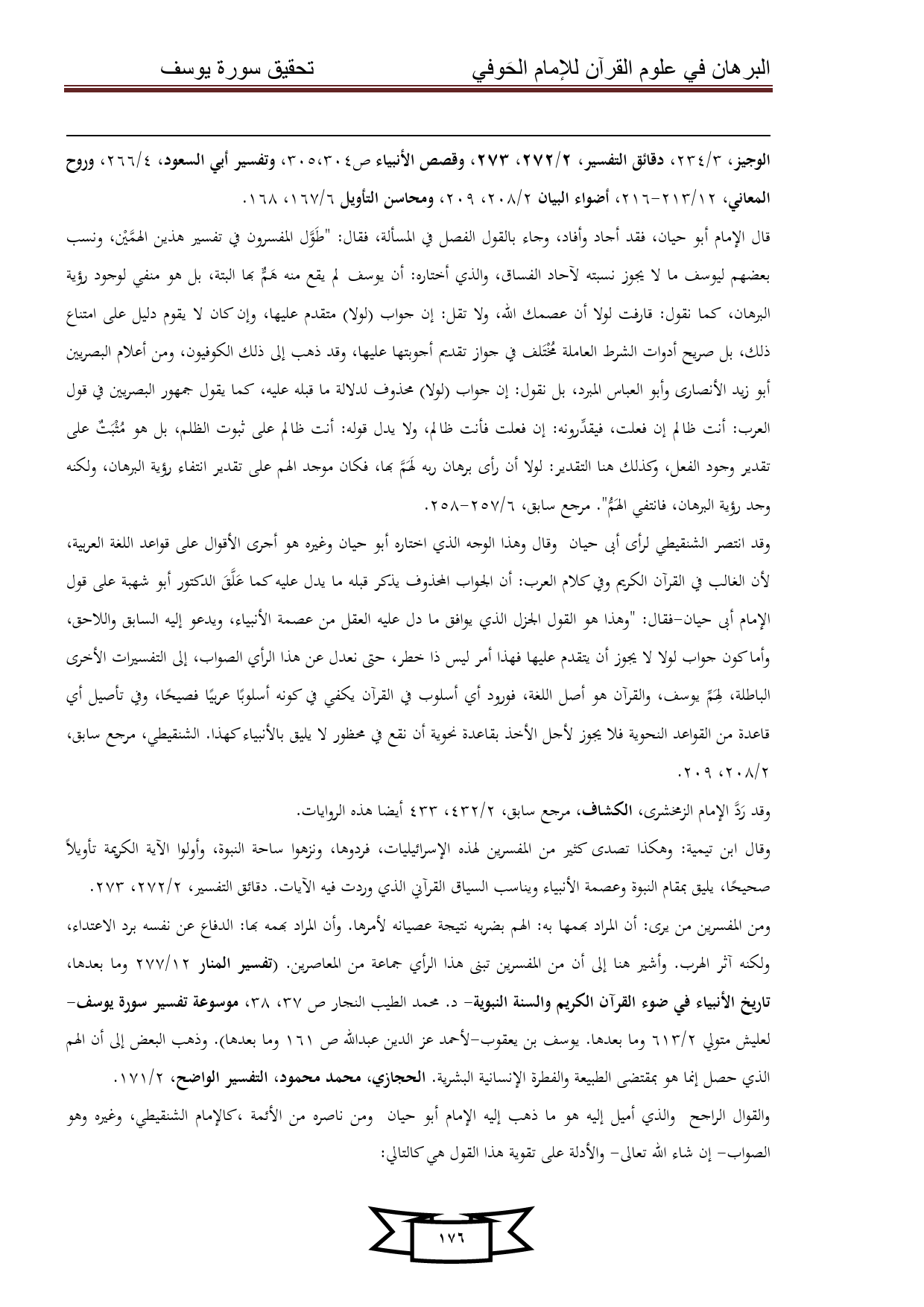 وقد انتصر الشنقيطي لرأى أبى حيان وقال وهذا الوجه الذي اختاره أبو حيان وغيره هو أجرى الأقوال على قواعد اللغة العربية، لأن الغالب في القرآن الكريم وفي كلام العرب: أن الجواب المحذوف يذكر قبله ما يدل عليه كما عَلَّقَ الدكتور أبو شهبة على قول الإمام أبى حيان-فقال: "وهذا هو القول الجزل الذي يوافق ما دل عليه العقل من عصمة الأنبياء، ويدعو إليه السابق واللاحق، وأما كون جواب لولا لا يجوز أن يتقدم عليها فهذا أمر ليس ذا خطر، حتى نعدل عن هذا الرأي الصواب، إلى التفسيرات الأخرى الباطلة، لِهَمِّ يوسف، والقرآن هو أصل اللغة، فورود أي أسلوب في القرآن يكفي في كونه أسلوبًا عربيًا فصيحًا، وفي تأصيل أي قاعدة من القواعد النحوية فلا يجوز لأجل الأخذ بقاعدة نحوية أن نقع في محظور لا يليق بالأنبياء كهذا. الشنقيطي، مرجع سابق، 2/ 208، 209.