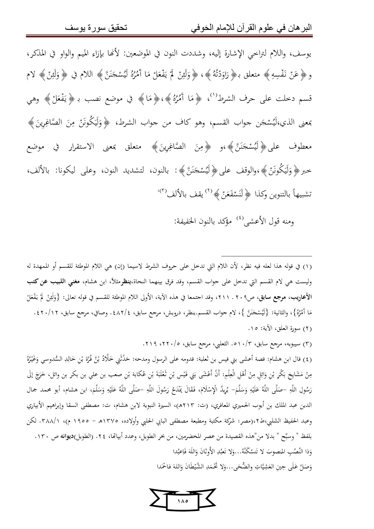 (¬1) في قوله هذا لعله فيه نظر، لأن اللام التي تدخل على حروف الشرط لاسيما (إن) هي اللام الموطئة للقسم أو الممهدة له وليست هي لام القسم التي تدخل على جواب القسم، وقد فرق بينهما النحاة، ينظرمثلاً، ابن هشام، مغني اللبيب عن كتب الأعاريب، مرجع سابق، ص 209 ـ 211، وقد اجتمعا في هذه الآية، الأولى اللام الموطئة للقسم في قوله تعالى: {وَلَئِنْ لَمْ يَفْعَلْ مَا آَمُرُهُ}، والثانية: {لَيُسْجَنَنَّ}، لام جواب القسم. ينظر، درويش، مرجع سابق، 4/ 482. وصافي، مرجع سابق، 12/ 420.