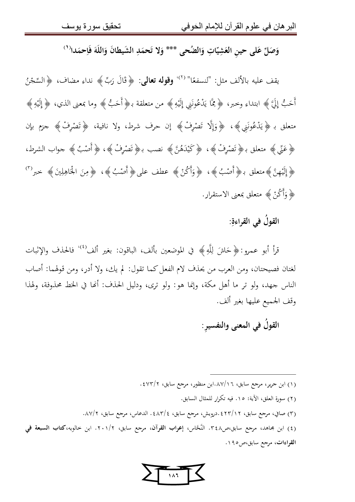 يقف عليه بالألف مثل: "لنسفعًا" (¬2)، وقوله تعالى: {قَالَ رَبِّ} نداء مضاف, {السِّجْنُ أَحَبُّ إِلَيَّ} ابتداء وخبر, {مِمَّا يَدْعُونَنِي إِلَيْهِ} من متعلقة بـ {أَحَبُّ} وما بمعنى الذي, {إِلَيْهِ} متعلق بـ {يَدْعُونَنِي} , {وَإِلَّا تَصْرِفْ} إن حرف شرط, ولا نافية, {تَصْرِفْ} جزم بإن {عَنِّي} متعلق بـ {تَصْرِفْ} , {كَيْدَهُنَّ} نصب بـ {تَصْرِفْ} , {أَصْبُ} جواب الشرط, {إِلَيْهِنَّ} متعلق بـ {أَصْبُ} , {وَأَكُنْ} عطف على {أَصْبُ} , {مِنَ الْجَاهِلِينَ} خبر (¬3) {وَأَكُنْ} متعلق بمعنى الاستقرار.