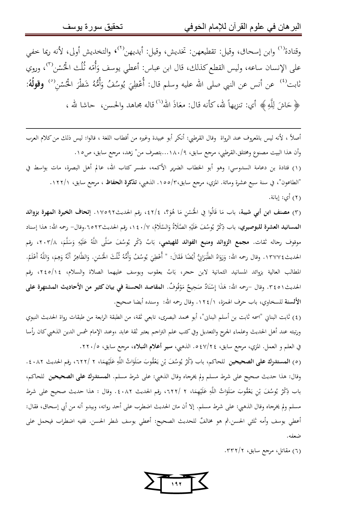 (¬5) المستدرك على الصحيحين للحاكم، باب ذِكْرُ يُوسُفَ بْنِ يَعْقُوبَ صَلَوَاتُ اللَّهِ عَلَيْهِمَا، 2/ 622، رقم الحديث 4082. وقال: هذا حديث صحيح على شرط مسلم ولم يخرجاه وقال الذهبي: على شرط مسلم. المستدرك على الصحيحين للحاكم، باب ذِكْرُ يُوسُفَ بْنِ يَعْقُوبَ صَلَوَاتُ اللَّهِ عَلَيْهِمَا، 2/ 622، رقم الحديث 4082. وقال: هذا حديث صحيح على شرط مسلم ولم يخرجاه وقال الذهبي: على شرط مسلم. إلا أن متن الحديث اضطرب على أحد رواته، ويبدو أنه من أبي إسحاق، فقال: أعطي يوسف وأمه ثلثي الحسن. ثم هو مخالفٌ للحديث الصحيح: أعطي يوسف شطر الحسن. ففيه اضطراب فيحمل على ضعفه.
