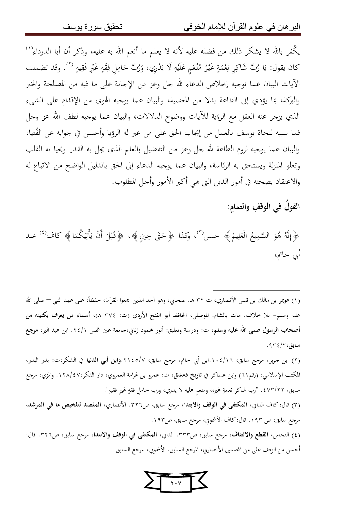 (¬4) النحاس، القطع والائتناف، مرجع سابق، ص 333. الداني، المكتفى في الوقف والابتدا، مرجع سابق، ص 326. قال: أحسن من الوقف على من المحسنين الأنصاري، المرجع السابق. الأشموني، المرجع السابق.