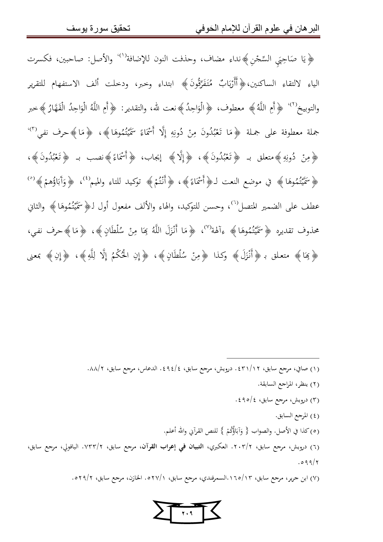 {يَا صَاحِبَيِ السِّجْنِ} نداء مضاف, وحذفت النون للإضافة (¬1)، والأصل: صاحبين, فكسرت الياء لالتقاء الساكنين, {أَأَرْبَابٌ مُتَفَرِّقُونَ} ابتداء وخبر, ودخلت ألف الاستفهام للتقرير والتوبيخ (¬2)، {أَمِ اللَّهُ} معطوف, {الْوَاحِدُ} نعت لله, والتقدير: {أَمِ اللَّهُ الْوَاحِدُ الْقَهَّارُ} خبر جملة معطوفة على جملة {مَا تَعْبُدُونَ مِنْ دُونِهِ إِلَّا أَسْمَاءً سَمَّيْتُمُوهَا} , {مَا} حرف نفي (¬3)، {مِنْ دُونِهِ} متعلق بـ {تَعْبُدُونَ} , {إِلَّا} إيجاب, {أَسْمَاءً} نصب بـ {تَعْبُدُونَ} , {سَمَّيْتُمُوهَا} في موضع النعت لـ {أَسْمَاءً} , {أَنْتُمْ} توكيد للتاء والميم (¬4) , {وَآَبَاؤُهمْ} (¬5) عطف على الضمير المتصل (¬6) , وحسن للتوكيد, والهاء والألف مفعول أول لـ {سَمَّيْتُمُوهَا} والثاني محذوف تقديره {سَمَّيْتُمُوهَا} ءآلهة (¬7) , {مَا أَنْزَلَ اللَّهُ بِهَا مِنْ سُلْطَانٍ}، {مَا} حرف نفي, {بِهَا} متعلق بـ {أَنْزَلَ} وكذا {مِنْ سُلْطَانٍ} , {إِنِ الْحُكْمُ إِلَّا لِلَّهِ} , {إِنِ} بمعنى
