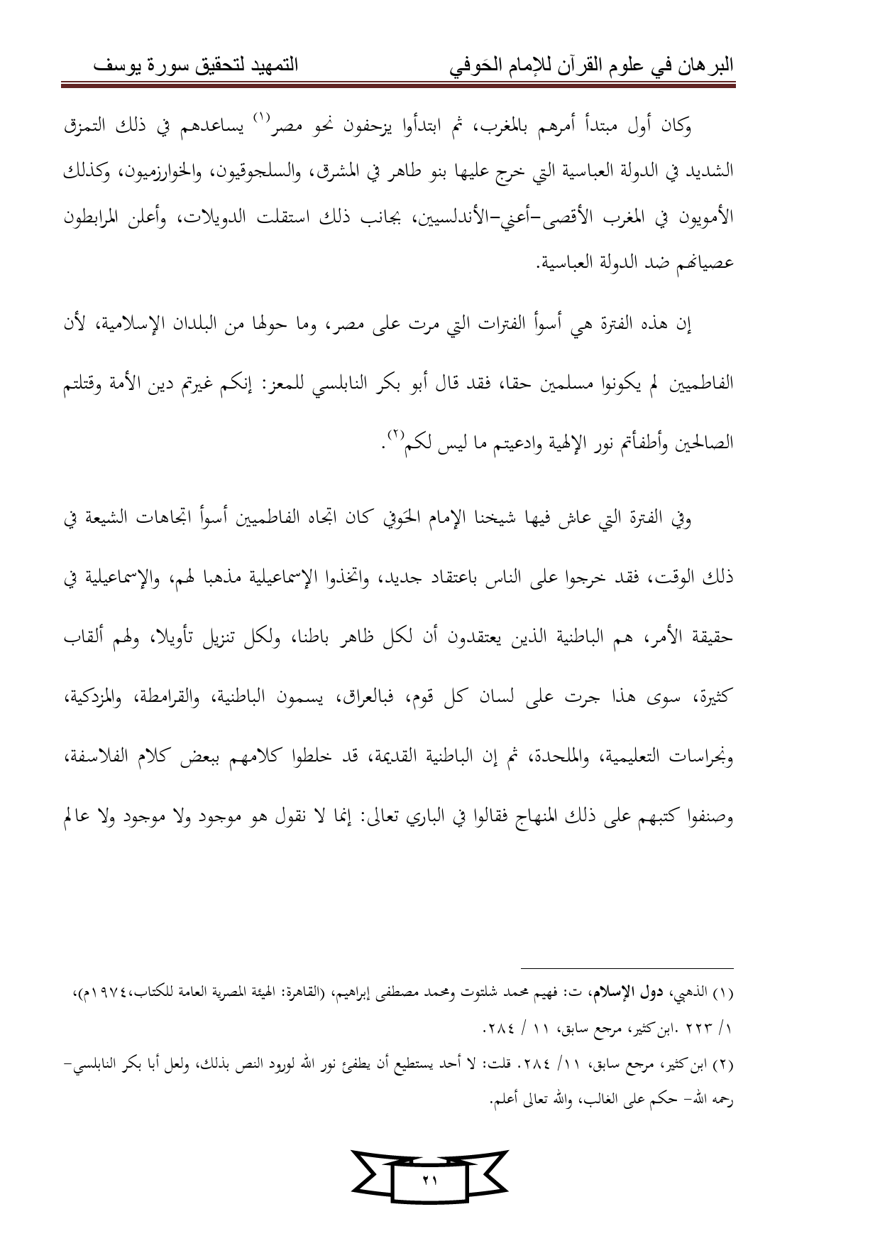 وفي الفترة التي عاش فيها شيخنا الإمام الحَوفي كان اتجاه الفاطميين أسوأ اتجاهات الشيعة في ذلك الوقت، فقد خرجوا على الناس باعتقاد جديد، واتخذوا الإسماعيلية مذهبا لهم، والإسماعيلية في حقيقة الأمر، هم الباطنية الذين يعتقدون أن لكل ظاهر باطنا، ولكل تنزيل تأويلا، ولهم ألقاب كثيرة، سوى هذا جرت على لسان كل قوم، فبالعراق، يسمون الباطنية، والقرامطة، والمزدكية، ونجراسات التعليمية، والملحدة، ثم إن الباطنية القديمة، قد خلطوا كلامهم ببعض كلام الفلاسفة، وصنفوا كتبهم على ذلك المنهاج فقالوا في الباري تعالى: إنما لا نقول هو موجود ولا موجود ولا عالم
