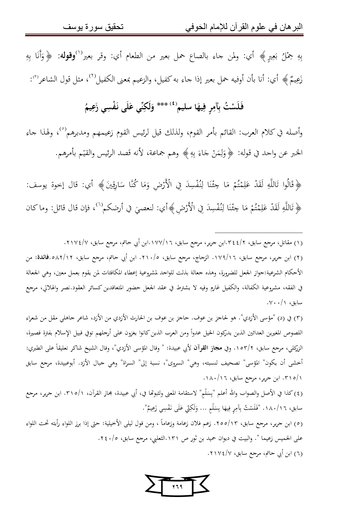 وأصله في كلام العرب: القائم بأمر القوم, ولذلك قيل لرئيس القوم زعيمهم ومدبرهم (¬5) , ولهذا جاء الخبر عن واحد في قوله: {وَلِمَنْ جَاءَ بِهِ} وهم جماعة, لأنه قصد الرئيس والقيّم بأمرهم.