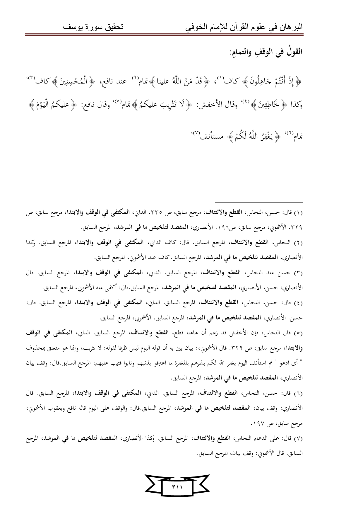 (¬1) قال: حسن، النحاس، القطع والائتناف، مرجع سابق، ص 335. الداني، المكتفى في الوقف والابتدا، مرجع سابق، ص 329. الأشموني، مرجع سابق، ص 196. الأنصاري، المقصد لتلخيص ما في المرشد، المرجع السابق.