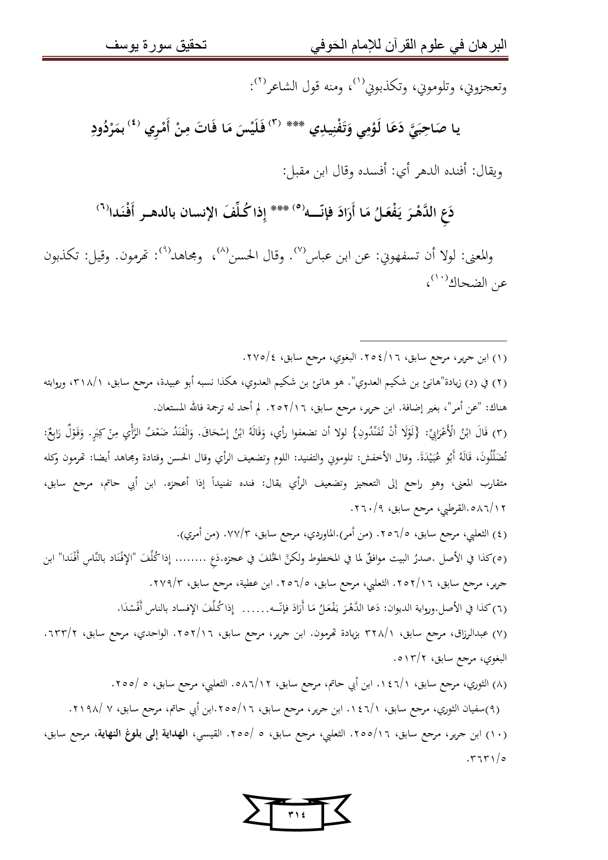 (¬5) كذا في الأصل. صدرُ البيت موافقٌ لما في المخطوط ولكنَّ الخُلفَ في عجزه. دَعِ ........ إِذا كُلِّفَ "الإفْنَاد بالنِّاسِ أَفْنَدا" ابن جرير، مرجع سابق، 16/ 252. الثعلبي، مرجع سابق، 5/ 256. ابن عطية، مرجع سابق، 3/ 279.