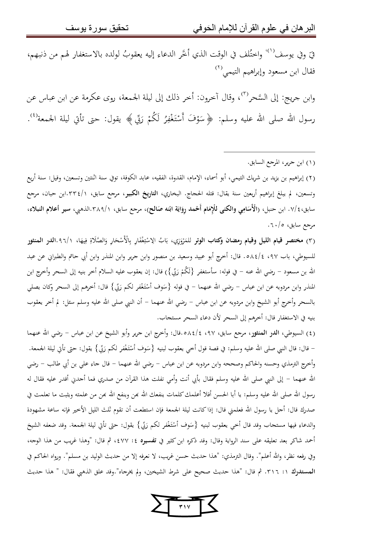 (¬4) السيوطي، الدر المنثور، مرجع سابق، 97، 4/ 584.قال: وأخرج ابن جرير وأبو الشيخ عن ابن عباس - رضي الله عنهما - قال: قال النبي صلى الله عليه وسلم: في قصة قول أخي يعقوب لبنيه {سَوف أسْتَغْفر لكم رَبِّي} يقول: حتى تأتي ليلة الجمعة.