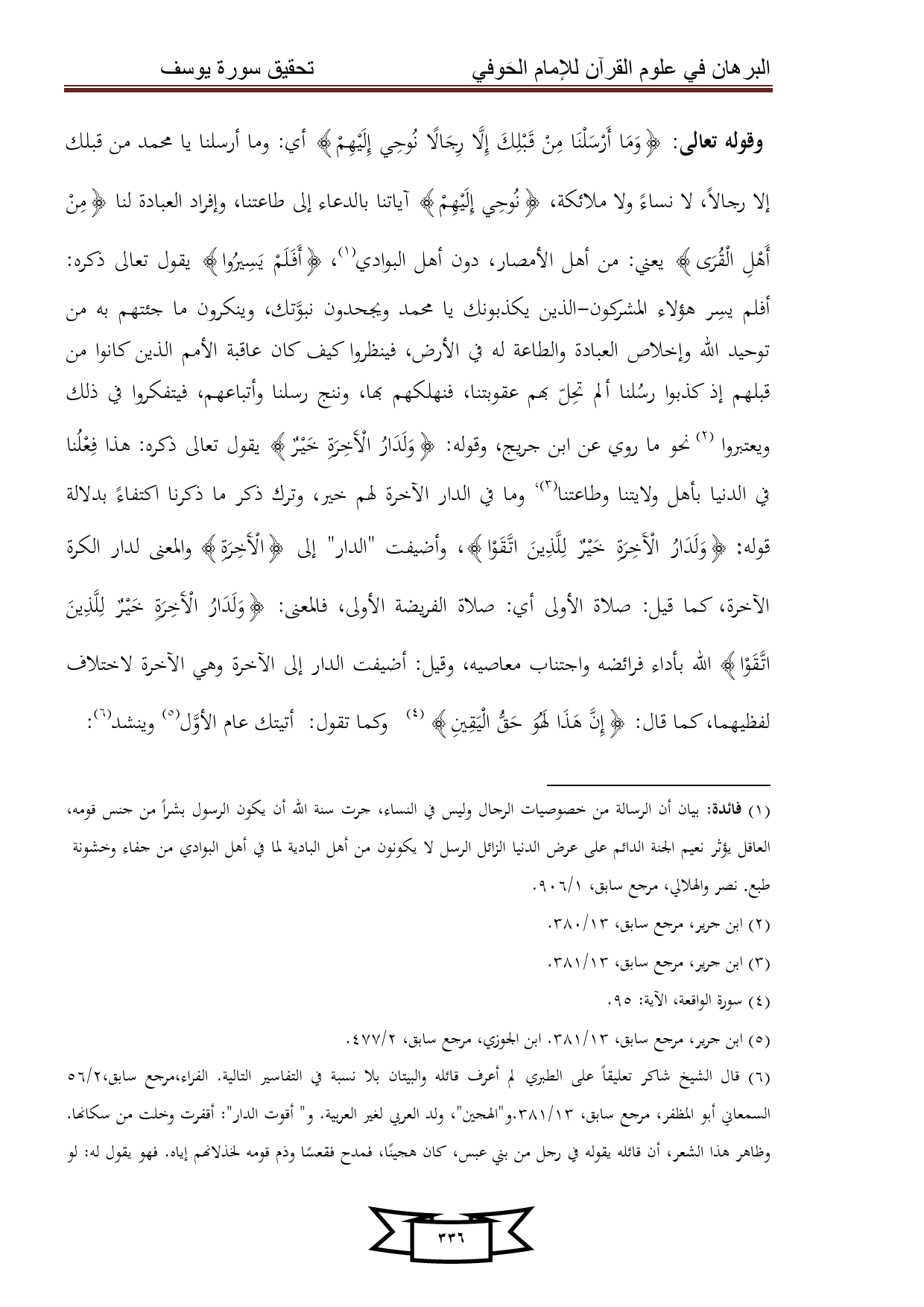 وقوله تعالى: {وَمَا أَرْسَلْنَا مِنْ قَبْلِكَ إِلَّا رِجَالًا نُوحِي إِلَيْهِمْ} أي: وما أرسلنا يا محمد من قبلك إلا رجالاً, لا نساءً ولا ملائكة, {نُوحِي إِلَيْهِمْ} آياتنا بالدعاء إلى طاعتنا, وإفراد العبادة لنا {مِنْ أَهْلِ الْقُرَى} يعني: من أهل الأمصار, دون أهل البوادي (¬1) , {أَفَلَمْ يَسِيرُوا} يقول تعالى ذكره: أفلم يسِر هؤلاء المشركون-الذين يكذبونك يا محمد ويجحدون نبوَّتك, وينكرون ما جئتهم به من توحيد الله وإخلاص العبادة والطاعة له في الأرض، فينظروا كيف كان عاقبة الأمم الذين كانوا من قبلهم إذ كذبوا رسُلنا ألم تحِلّ بهم عقوبتنا, فنهلكهم بها, وننج رسلنا وأتباعهم, فيتفكروا في ذلك ويعتبروا (¬2) نحو ما روي عن ابن جريج, وقوله: {وَلَدَارُ الْآَخِرَةِ خَيْرٌ} يقول تعالى ذكره: هذا فِعْلُنا في الدنيا بأهل ولايتنا وطاعتنا (¬3)، وما في الدار الآخرة لهم خير، وترك ذكر ما ذكرنا اكتفاءً بدلالة قوله: {وَلَدَارُ الْآَخِرَةِ خَيْرٌ لِلَّذِينَ اتَّقَوْا} , وأضيفت "الدار" إلى {الْآَخِرَةِ} والمعنى لدار الكرة الآخرة, كما قيل: صلاة الأولى أي: صلاة الفريضة الأولى, فالمعنى: {وَلَدَارُ الْآَخِرَةِ خَيْرٌ لِلَّذِينَ اتَّقَوْا} الله بأداء فرائضه واجتناب معاصيه, وقيل: أضيفت الدار إلى الآخرة وهي الآخرة لاختلاف لفظيهما, كما قال: {إِنَّ هَذَا لَهُوَ حَقُّ الْيَقِينِ} (¬4) وكما تقول: أتيتك عام الأوَّل (¬5)