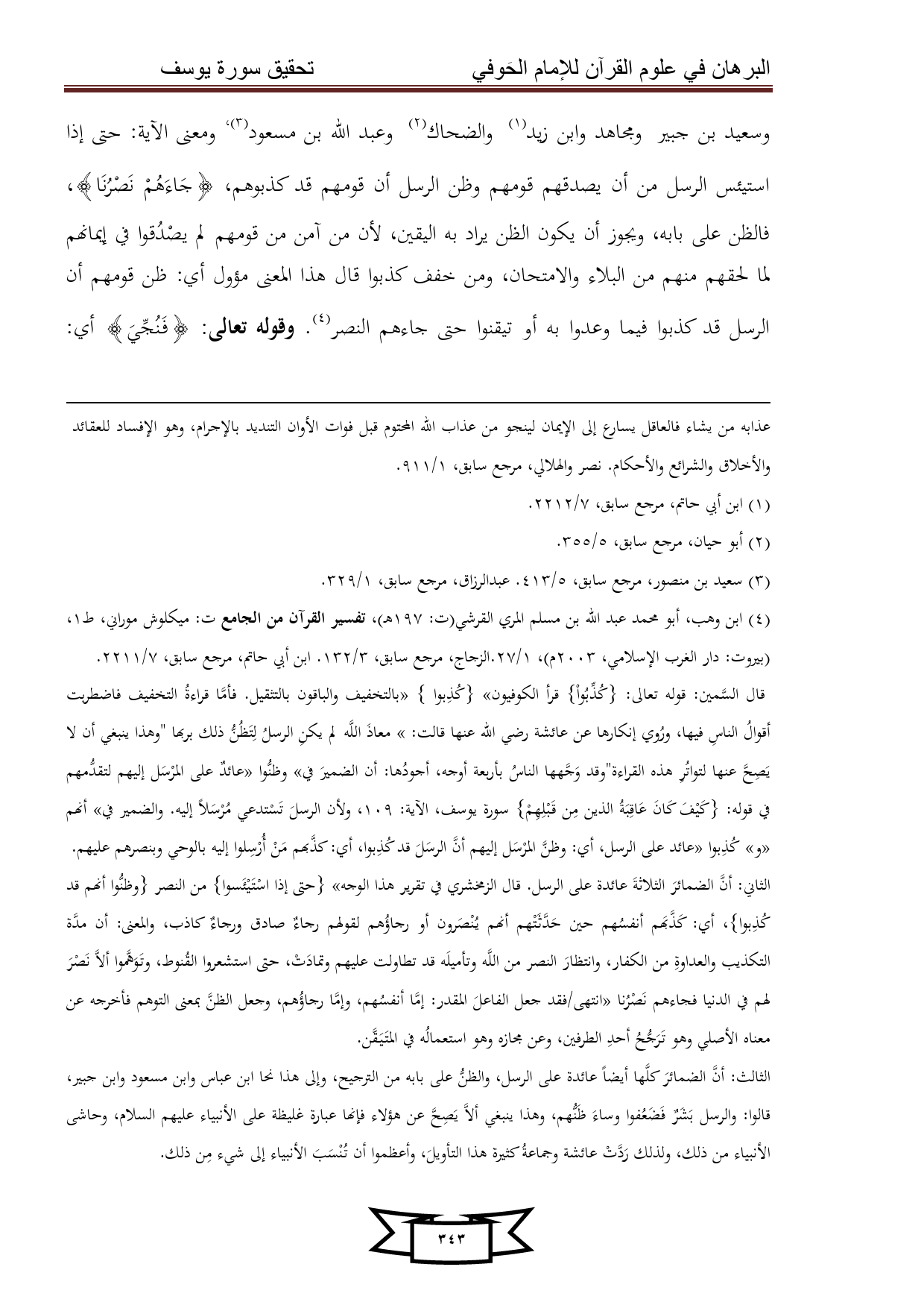 الثالث: أنَّ الضمائرَ كلَّها أيضاً عائدة على الرسل، والظنُّ على بابه من الترجيح، وإلى هذا نحا ابن عباس وابن مسعود وابن جبير، قالوا: والرسل بَشَرٌ فَضَعُفوا وساءَ ظَنُّهم، وهذا ينبغي ألاَّ يَصِحَّ عن هؤلاء فإنها عبارة غليظة على الأنبياء عليهم السلام، وحاشى الأنبياء من ذلك، ولذلك رَدَّتْ عائشة وجماعةُ كثيرة هذا التأويلَ، وأعظموا أن تُنْسَبَ الأنبياء إلى شيء مِن ذلك. =