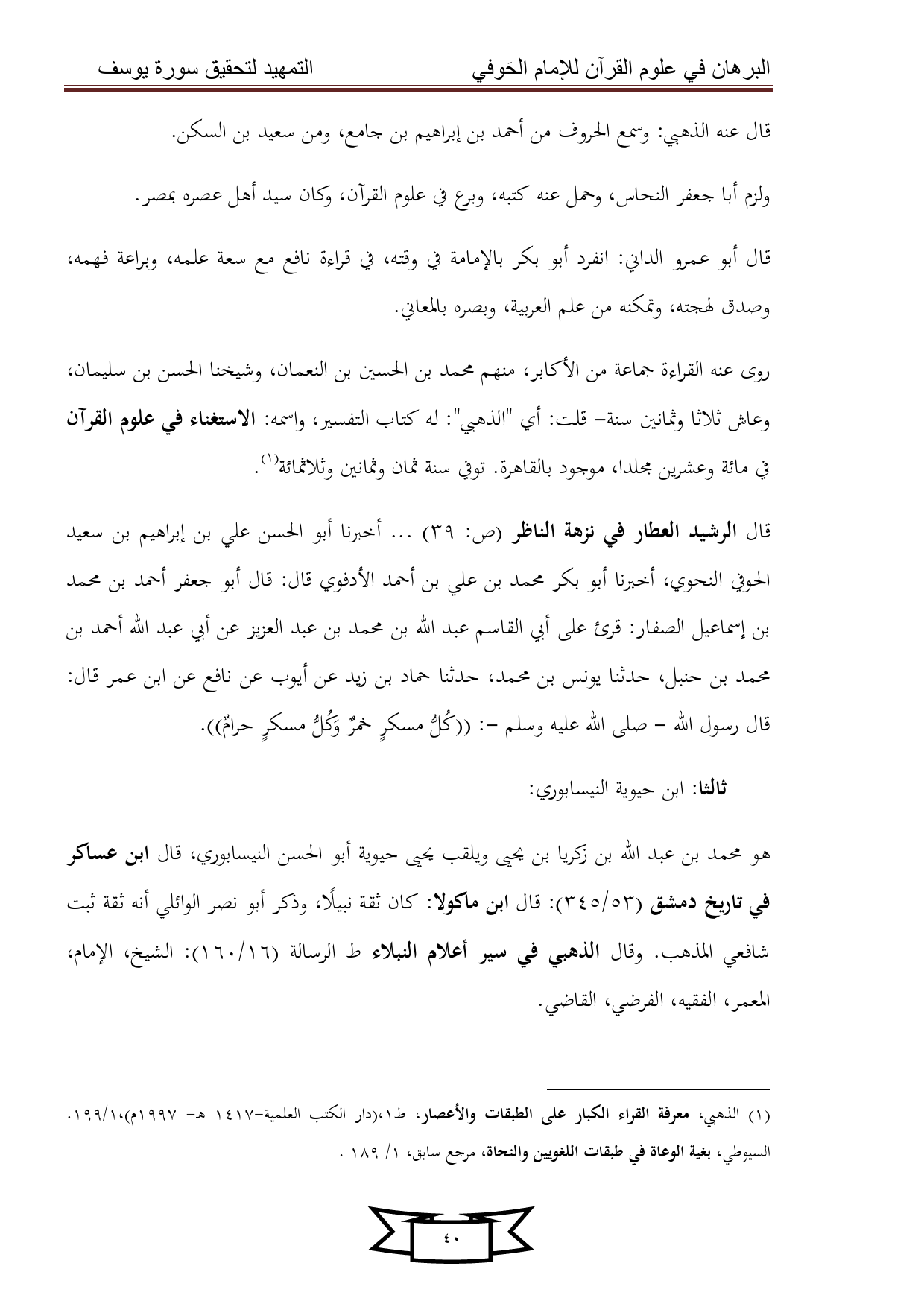 (¬1) الذهبي، معرفة القراء الكبار على الطبقات والأعصار، ط 1، (دار الكتب العلمية-1417 هـ- 1997 م)،1/ 199. السيوطي، بغية الوعاة في طبقات اللغويين والنحاة، مرجع سابق، 1/ 189.