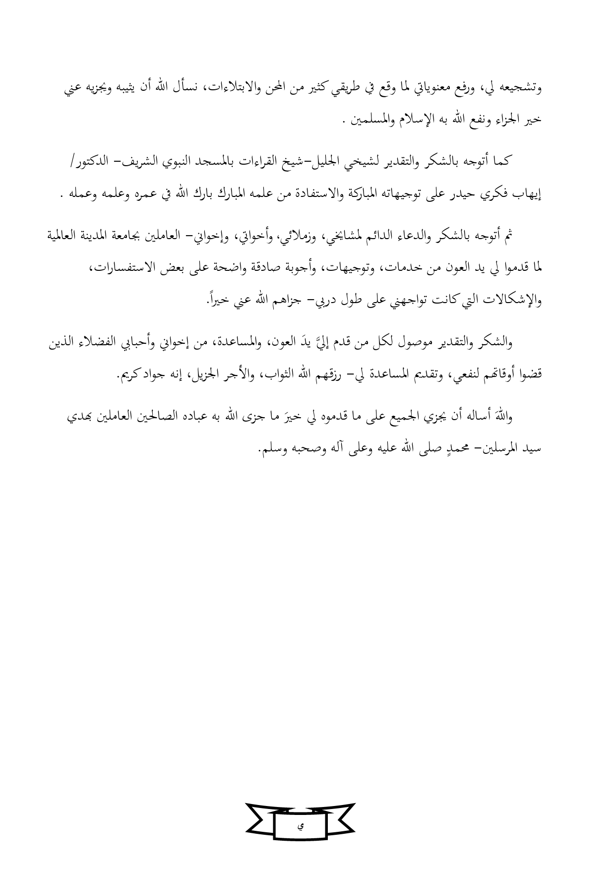 كما أتوجه بالشكر والتقدير لشيخي الجليل-شيخ القراءات بالمسجد النبوي الشريف- الدكتور/ إيهاب فكري حيدر على توجيهاته المباركة والاستفادة من علمه المبارك بارك الله في عمره وعلمه وعمله.