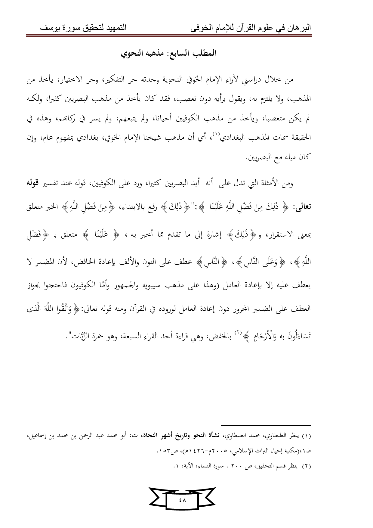 ومن الأمثلة التي تدل على أنه أيد البصريين كثيرا، ورد على الكوفيين، قوله عند تفسير قوله تعالى: {ذَلِكَ مِنْ فَضْلِ اللَّهِ عَلَيْنَا}:" {ذَلِكَ} رفع بالابتداء, {مِنْ فَضْلِ اللَّهِ} الخبر متعلق بمعنى الاستقرار, و {ذَلِكَ} إشارة إلى ما تقدم مما أخبر به , {عَلَيْنَا} متعلق بـ {فَضْلِ اللَّهِ} , {وَعَلَى النَّاسِ} , {النَّاسِ} عطف على النون والألف بإعادة الخافض, لأن المضمر لا يعطف عليه إلا بإعادة العامل (وهذا على مذهب سيبويه والجمهور وأمَّا الكوفيون فاحتجوا بجواز العطف على الضمير المجرور دون إعادة العامل لوروده في القرآن ومنه قوله تعالى: {وَاتَّقُوا اللَّهَ الَّذي تَسَاءَلُونَ به وَالْأَرْحَامِ} (¬2) بالخفض، وهي قراءة أحد القراء السبعة، وهو حمزة الزَّيَّات".