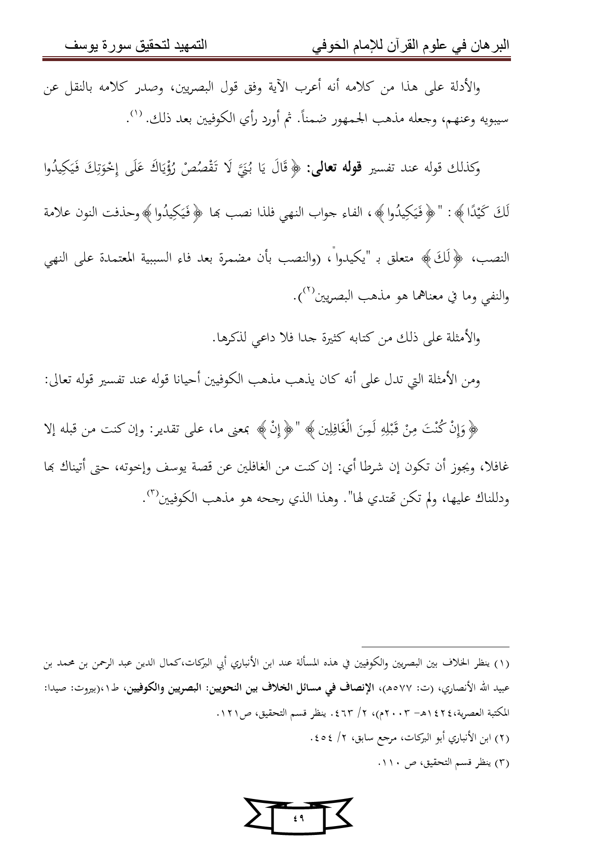 (¬1) ينظر الخلاف بين البصريين والكوفيين في هذه المسألة عند ابن الأنباري أبي البركات، كمال الدين عبد الرحمن بن محمد بن عبيد الله الأنصاري، (ت: 577 هـ)، الإنصاف في مسائل الخلاف بين النحويين: البصريين والكوفيين، ط 1، (بيروت: صيدا: المكتبة العصرية،1424 هـ- 2003 م)، 2/ 463. ينظر قسم التحقيق، ص 121.