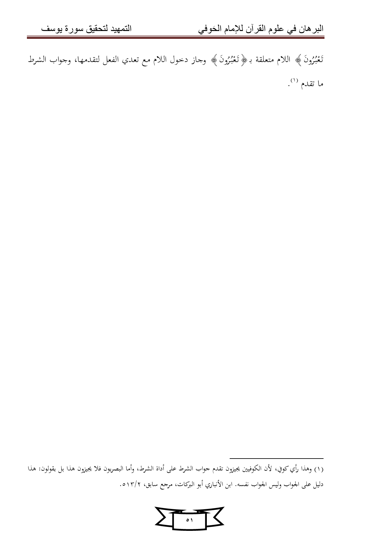 (¬1) وهذا رأي كوفي، لأن الكوفيين يجيزون تقدم جواب الشرط على أداة الشرط، وأما البصريون فلا يجيزون هذا بل يقولون: هذا دليل على الجواب وليس الجواب نفسه. ابن الأنباري أبو البركات، مرجع سابق، 2/ 513.